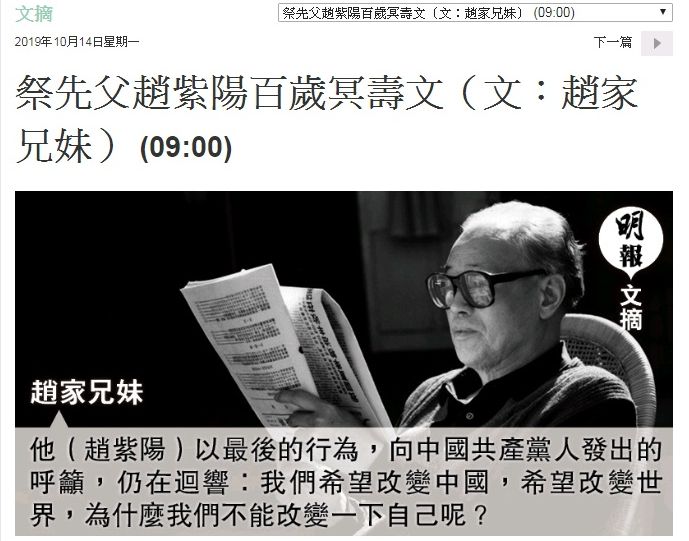 「黨無紫陽,國無指望」。趙紫陽百歲冥誕,他的兒女撰文回憶父親開明思維。 (圖:翻拍自明報網頁)