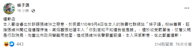 道歉函內容為「本人酈俊睿出於誹謗張維洲之惡意,於民國110年9月4日在本人的臉書社群網站『條子鴿』粉絲專頁,誣指張維洲闖紅燈遭攔停後,氣焰囂張地嗆本人『你到底知不知道我爸是誰』,還於收受罰單後,仗著父親是行政院長,向臺北市政府警察局施壓,造成張維洲名譽嚴重毀損,本人深感歉意,在此鄭重道歉。」