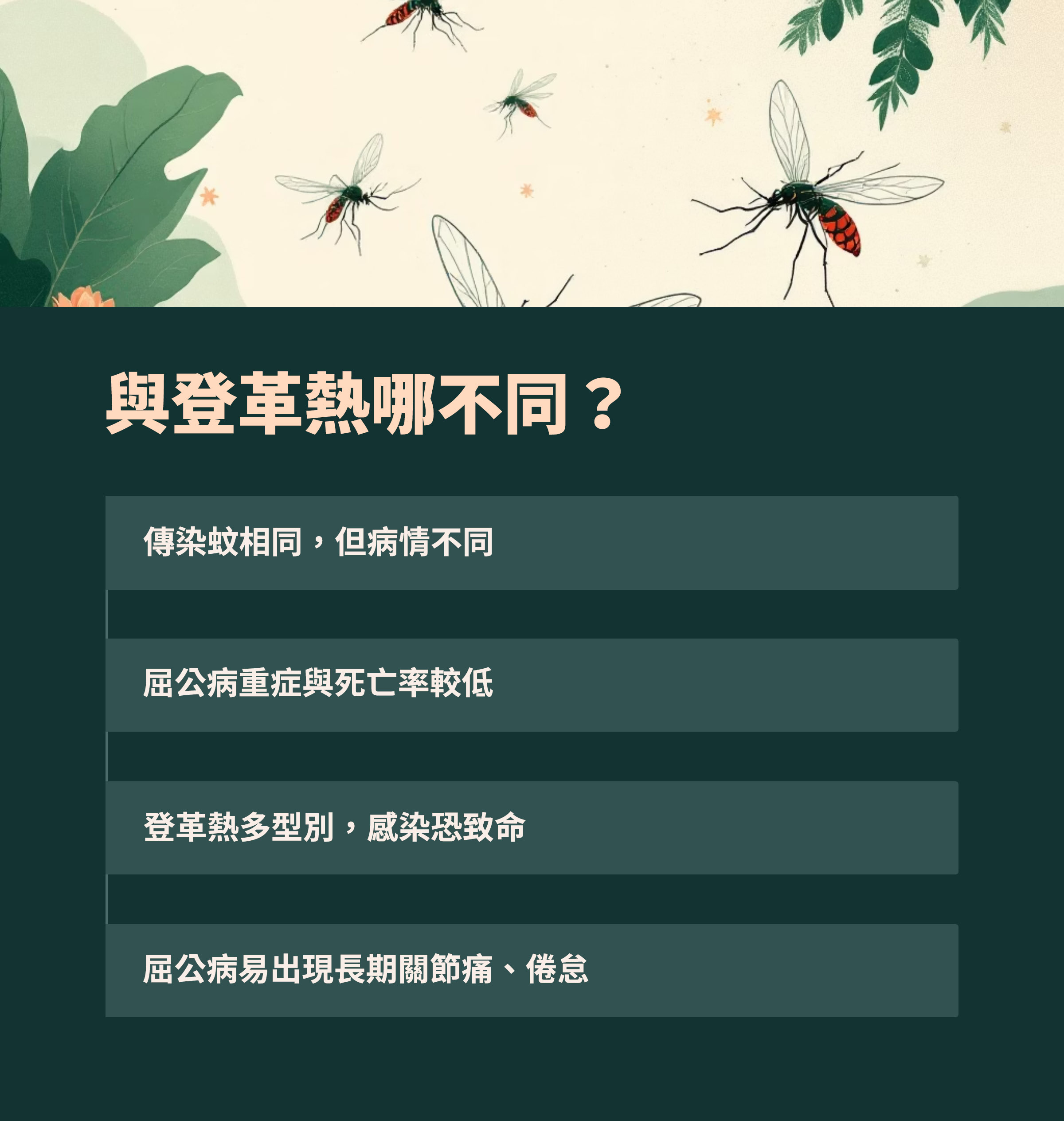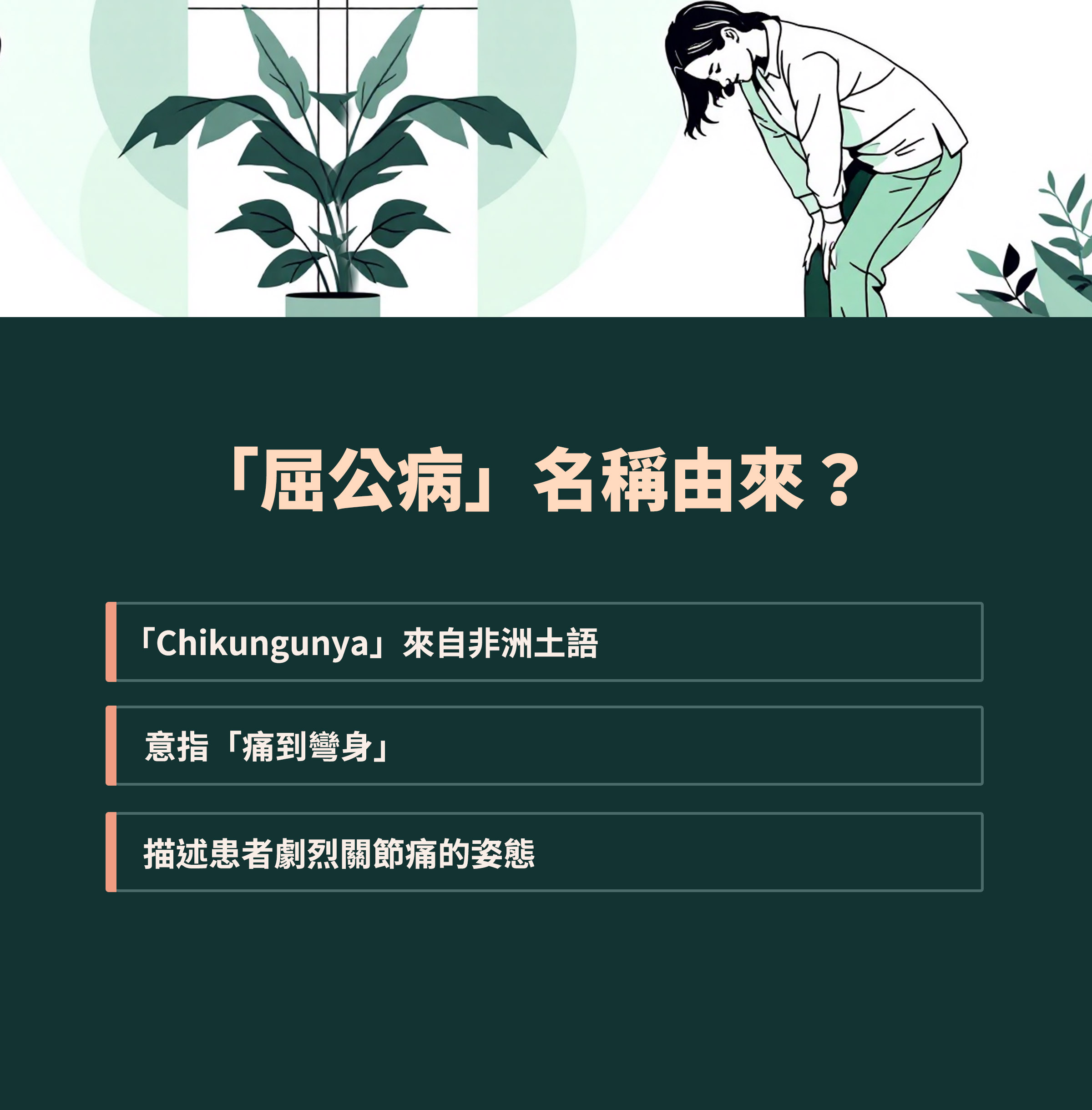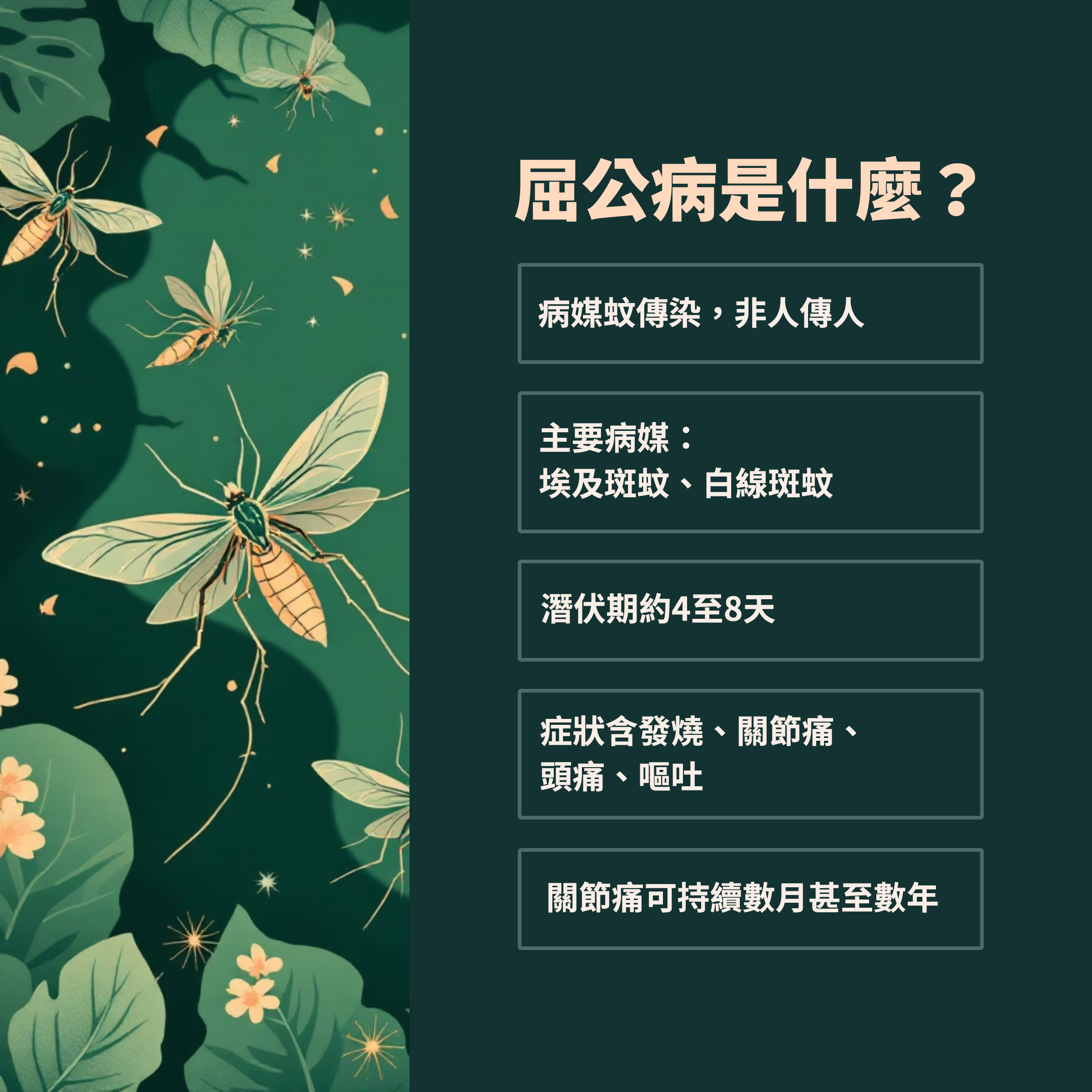 疾管署指出,屈公病的病媒蚊與登革熱相同,由帶病毒的白線斑蚊或埃及斑蚊叮咬傳播,潛伏期為2至12天。發病前2天至發病後5天為可傳染期,症狀包括突然發燒、關節痛、頭痛、噁心、嘔吐、疲倦、肌肉疼痛等,約半數患者會出現皮疹,症狀持續3至7天。與登革熱不同的是,部分感染屈公病的病人會持續數週的倦怠感,有些患者的關節甚至會痛到無法行動,較嚴重者可能會留下關節炎等後遺症。