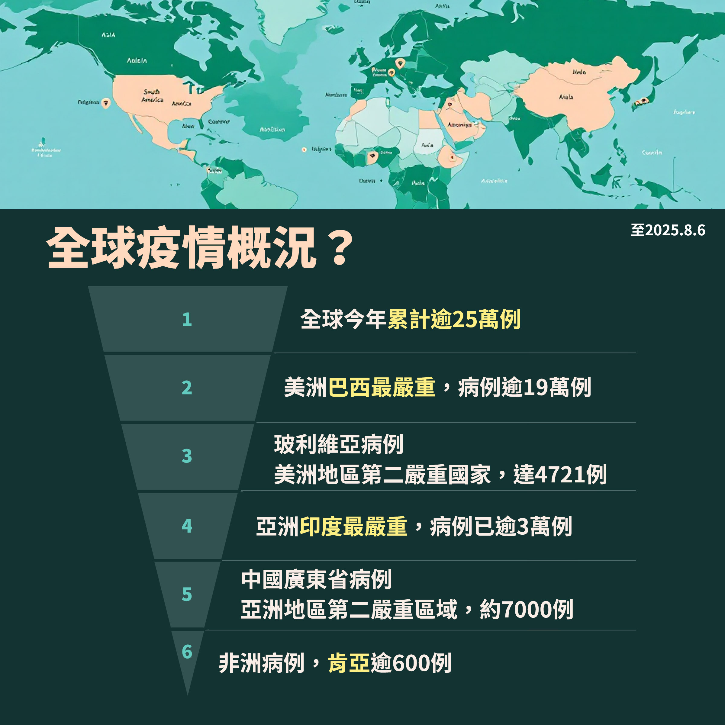 近來中國廣東省屈公病病例暴增,當地自7月8日報告首例境外移入病例後,迄今累計逾7千例病例,光是前一週便新增近3千例病例,其中又以佛山市疫情最嚴峻,95%個案集中在佛山市。該市近期每日新增病例數雖有下降趨勢,但個案仍多;而該省其他城市近期也陸續出現病例。澳門及香港等地也有移入個案,澳門近日更已出現本土病例,疾管署已於8月4日將中國廣東省的旅遊疫情建議等級提升至第二級「警示」。