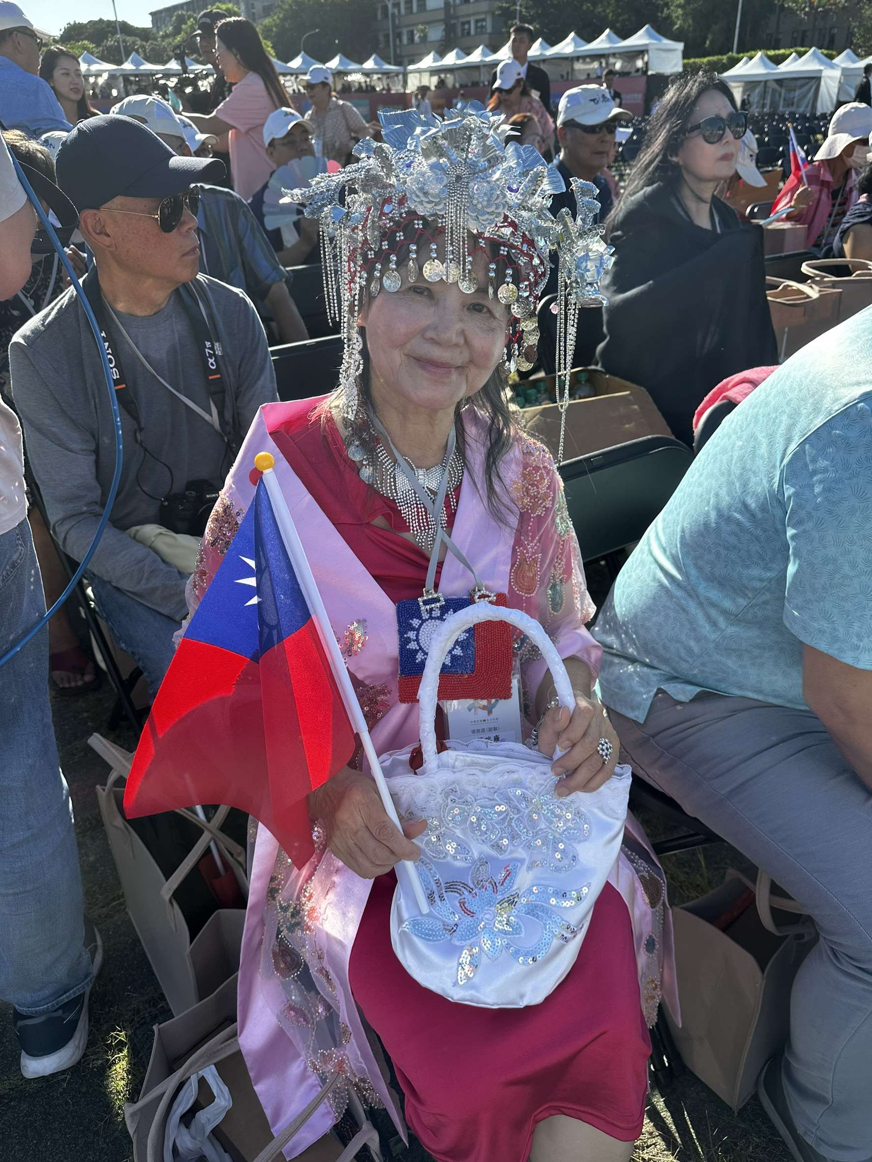 來自南非的趙瑞雍女士,盛裝出席國慶典禮,祝福台灣在國際舞台閃耀發光。(楊雨青攝)
