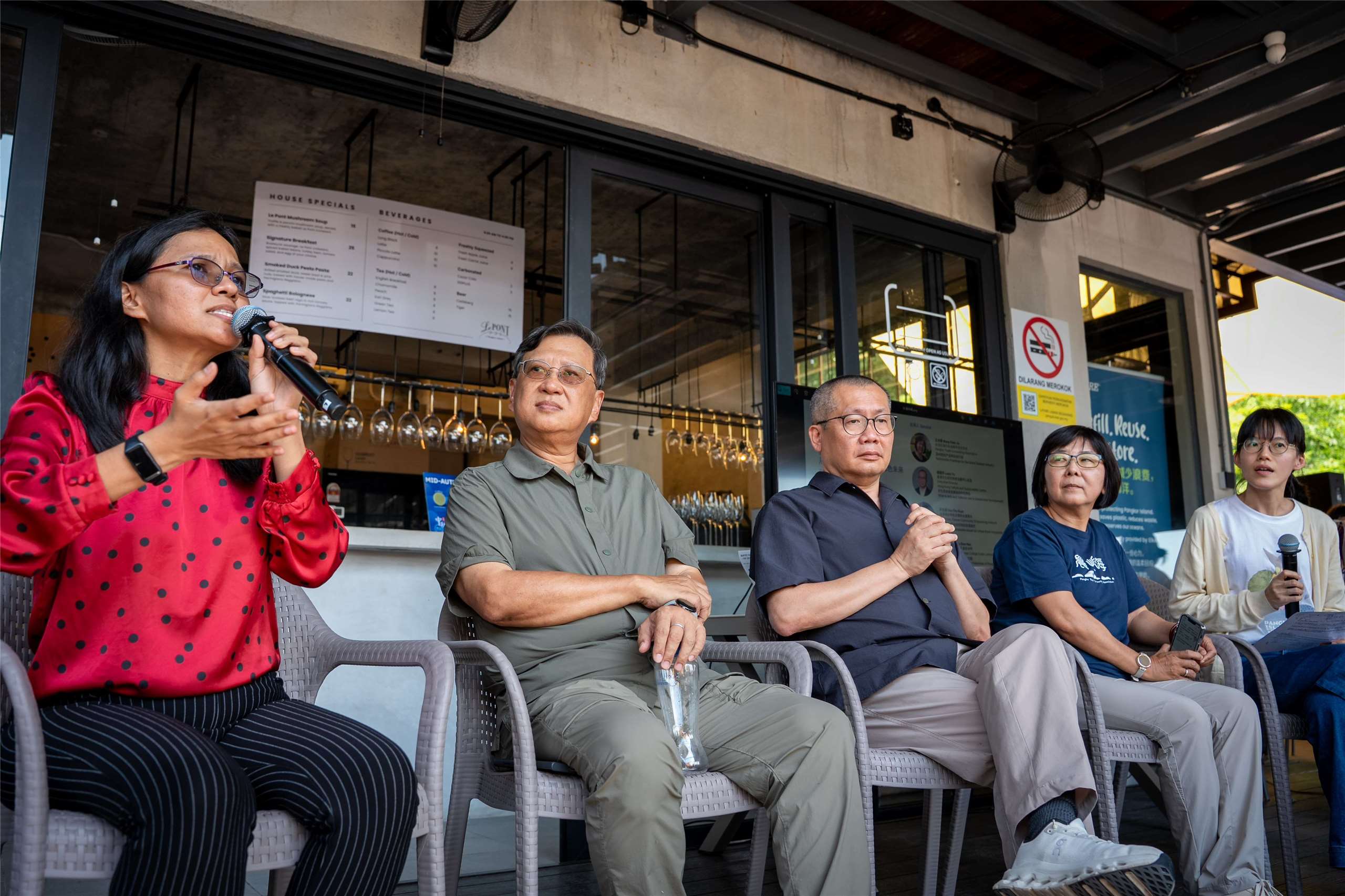 「島嶼未來式」永續論壇在馬來西亞邦咯島舉行,來自台灣的社區營造專家王貞儒(右二)與許主冠(左二)與馬來西亞雙威學院高級講師何秀娘、香港文化與可持續發展中心執行總監茹國烈齊聚一堂,共同探討如何讓島嶼在發展與保育之間找到平衡。(張欣薇攝)