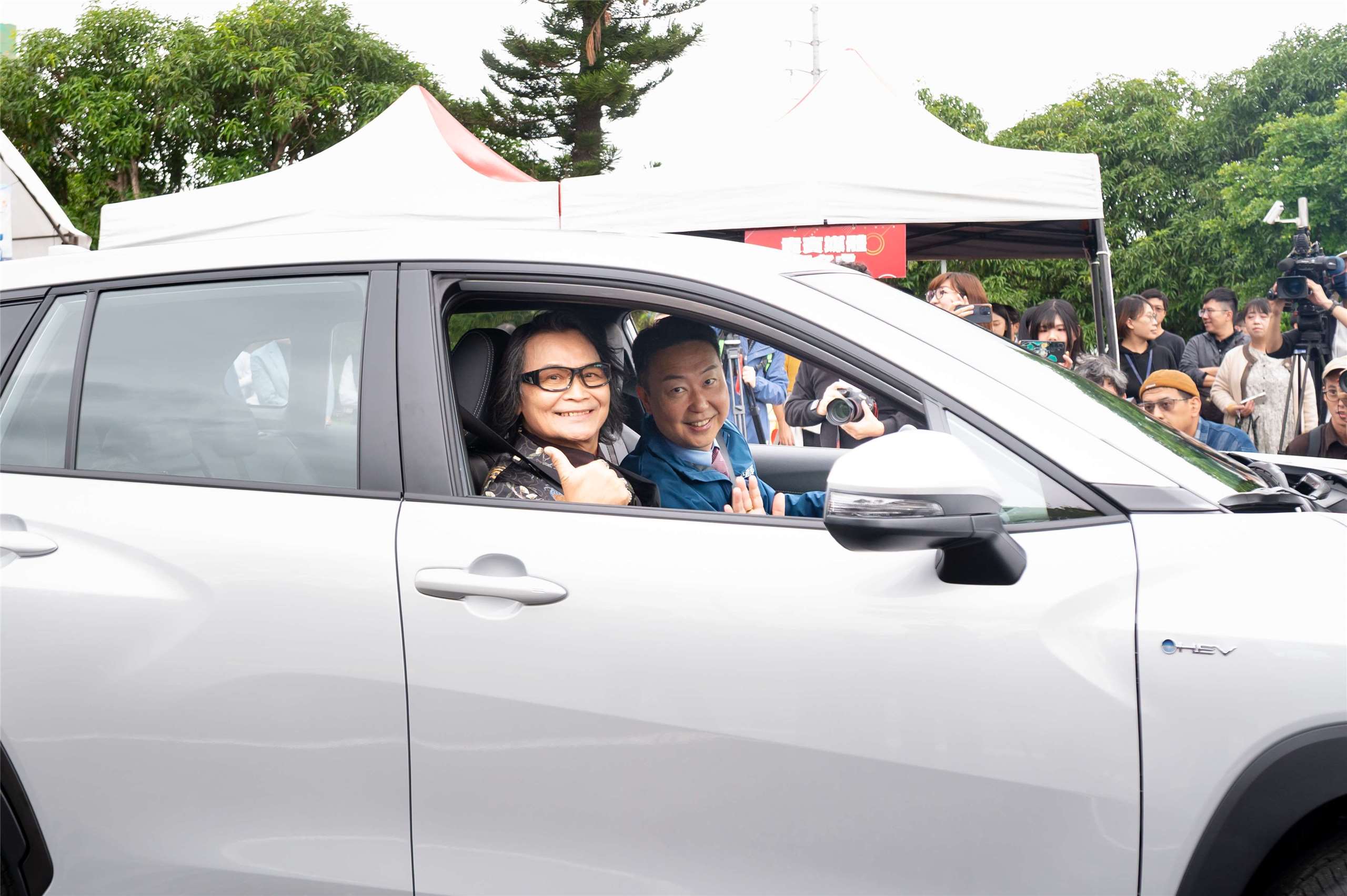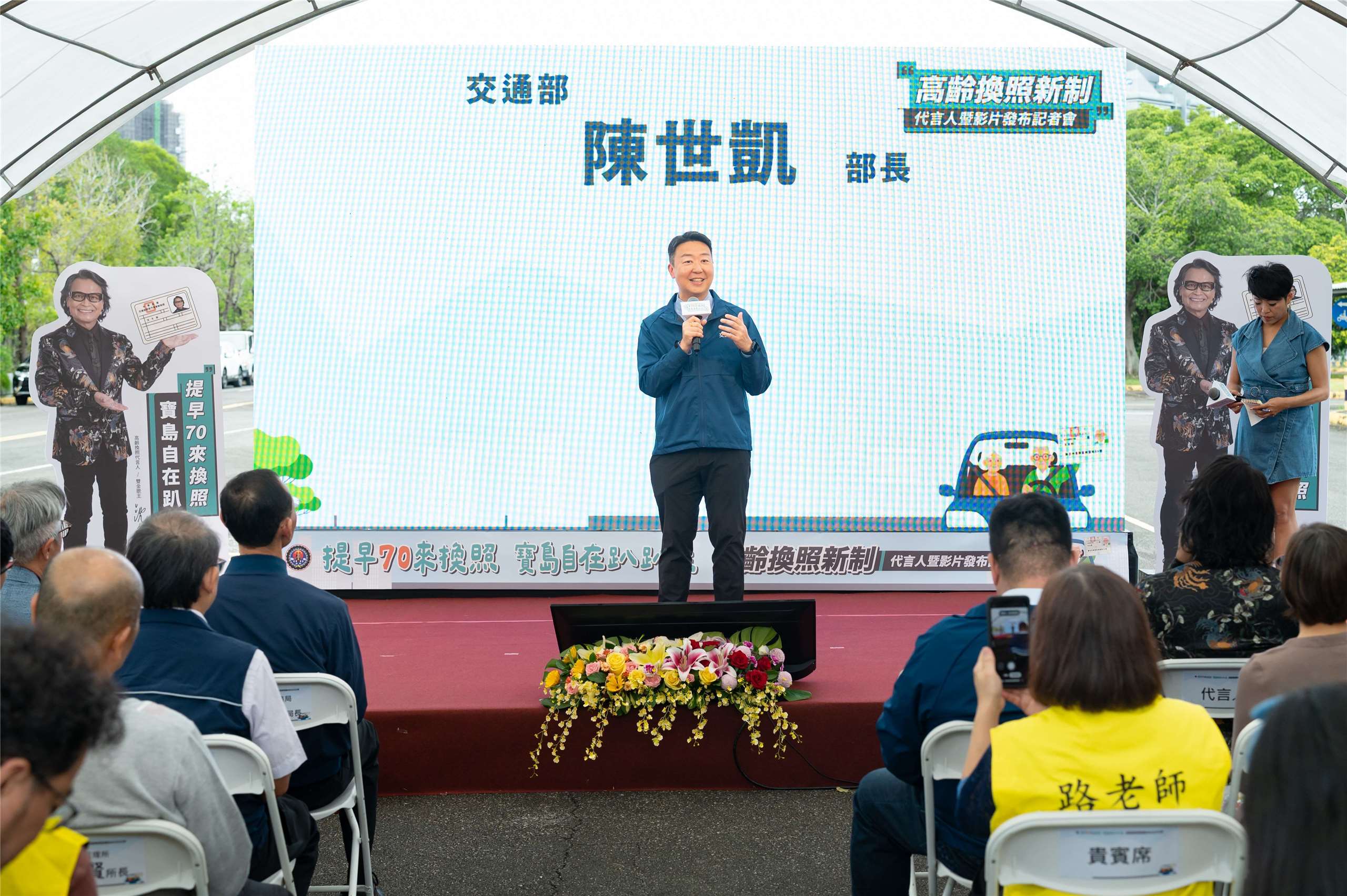 『(現場呼口號)提早70來換照,寶島自在趴趴走!』曾榮獲金鐘獎和金曲獎的雙金歌王沈文程,4日下午開車載著交通部長陳世凱驚喜現身台北士林監理站,為明年5月1日即將上路的高齡分級換照新制擔任代言人。