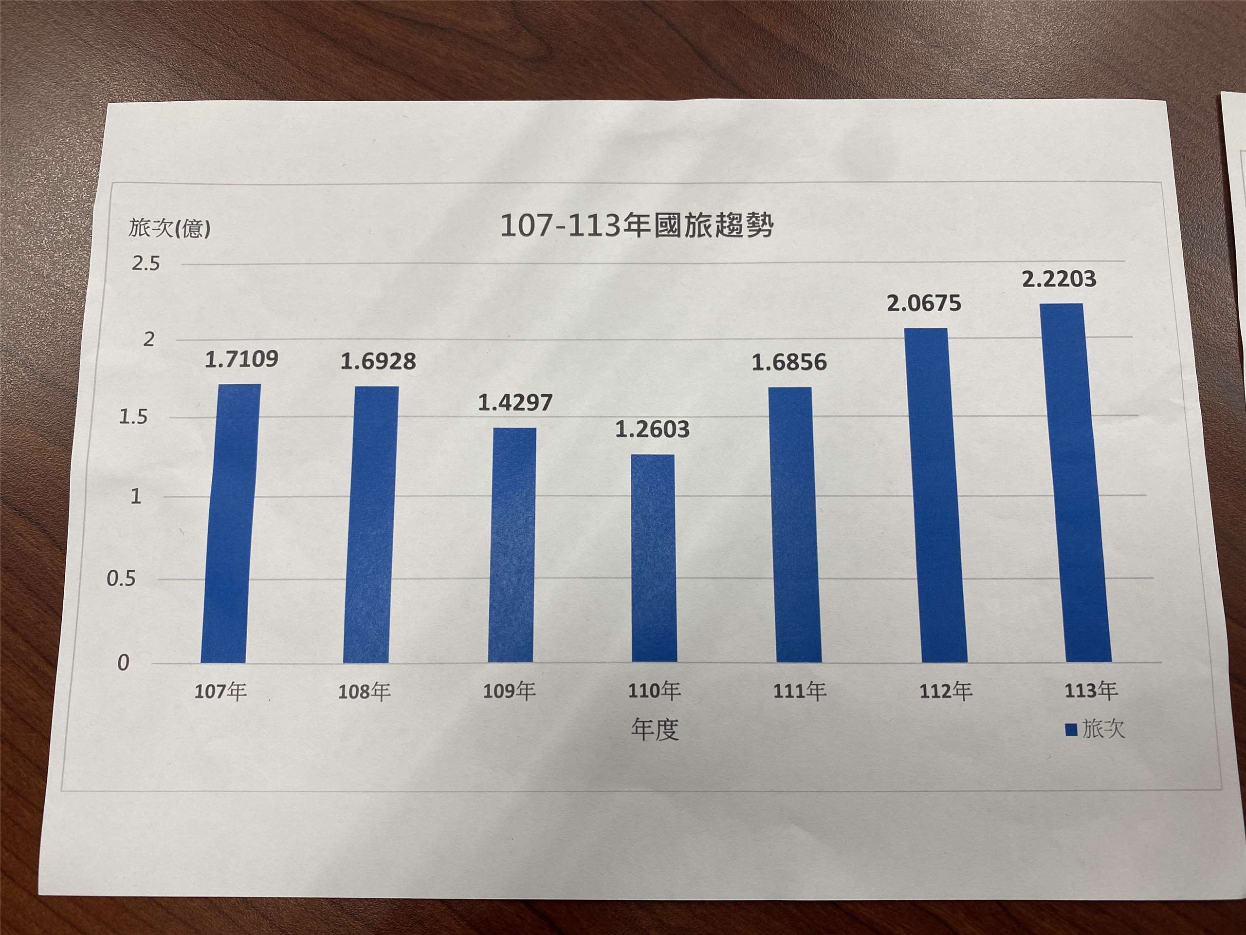 交通部長陳世凱13日出示的國旅歷年旅次統計圖表。(吳琍君攝)