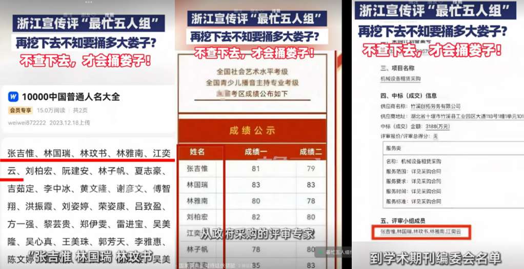 百度文庫「10000中國普通人名大全」中發現,「張吉惟、林國瑞、林玟書、林雅南、江奕雲」等五個名字反覆出現在眾多政府標案評審、比賽獲獎者,甚至公益項目受助名單中,被戲稱全網最忙五人組。(翻攝百度百科)
