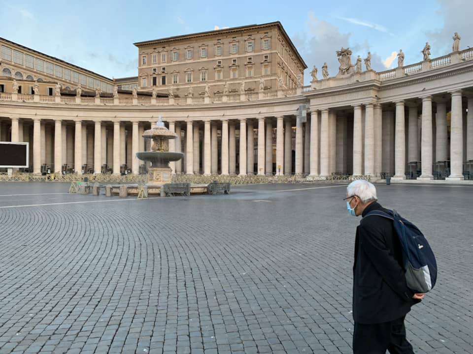 2020年9月陳日君冒著COVID-19疫情搭機10幾小時到羅馬(圖),希望向時任教宗方濟各說明中國教會遭迫害實況,最後未獲接見。(FB/@cardzen)