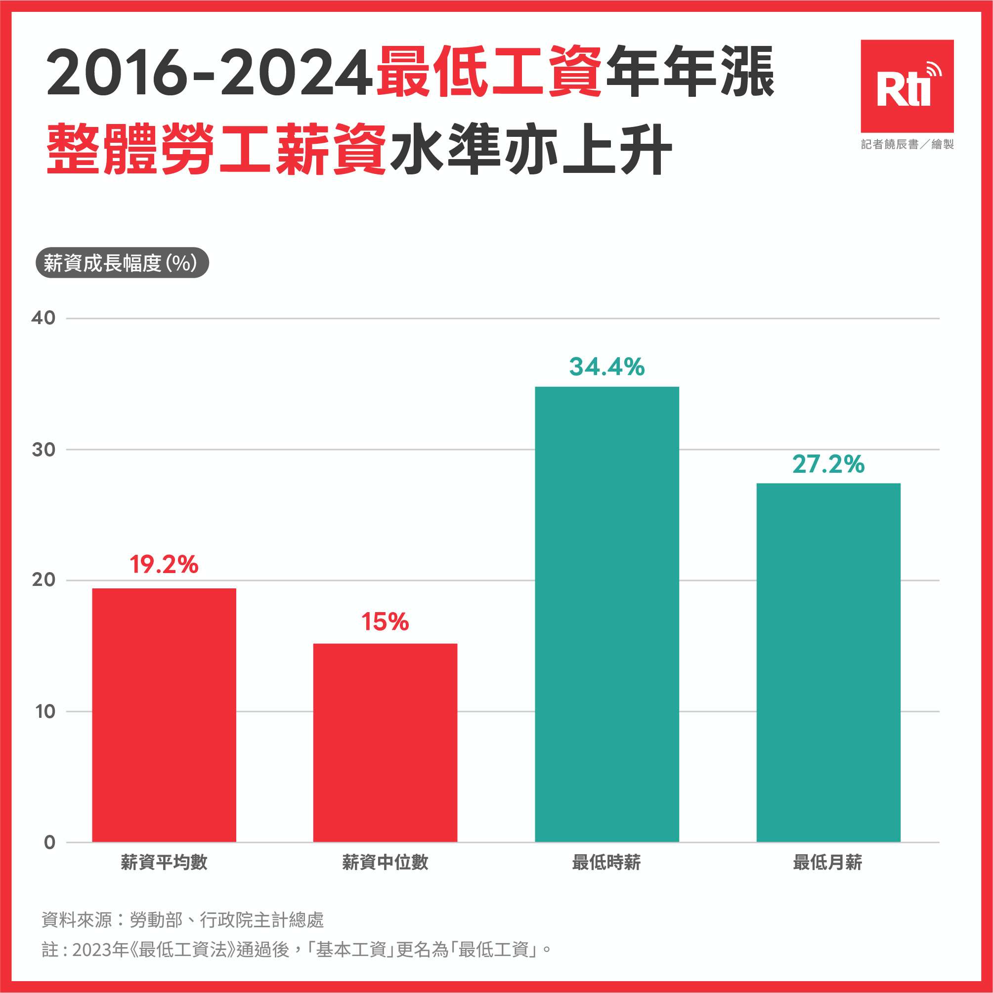 2016年至2024年基本工資連年調漲,整體薪資水準亦有所上升。(饒辰書 繪製)
