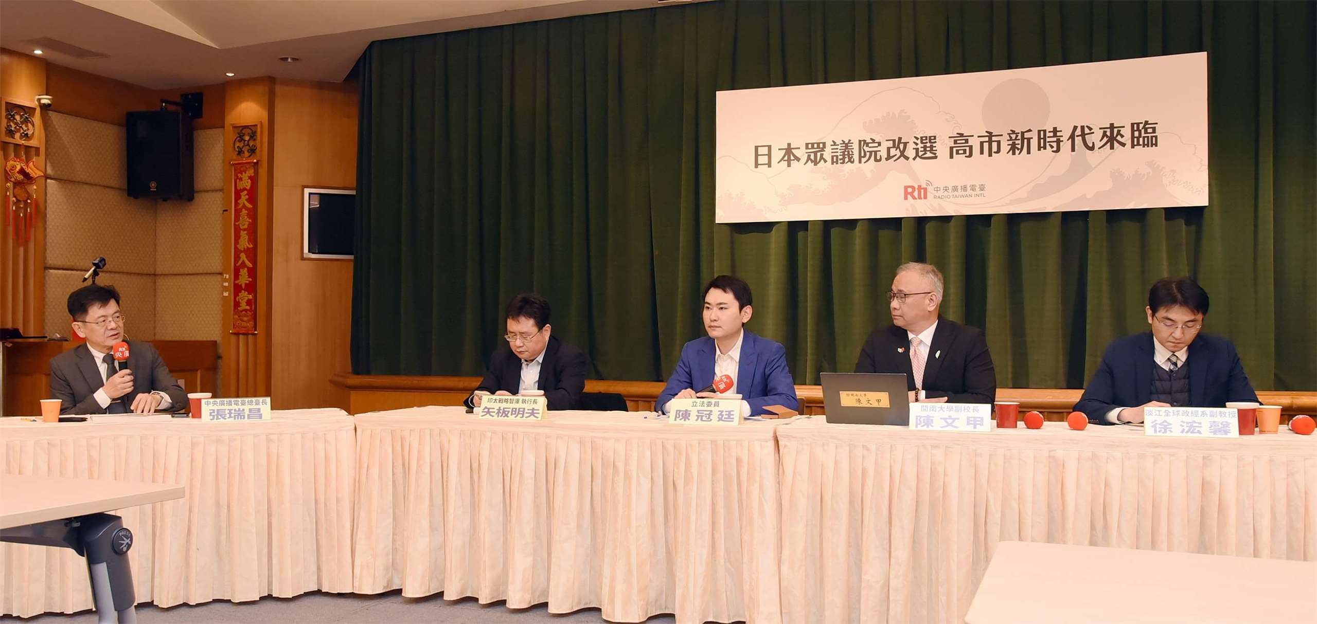 中央廣播電臺今天(9日)舉辦「日本眾議院改選 高市新時代來臨」座談會,邀請印太戰略智庫執行長矢板明夫(左二)、立法院外交及國防委員會立委陳冠廷(左三)、開南大學副校長暨國家區域發展研究中心主任陳文甲(右二)以及淡江大學全球政治經濟系副教授徐浤馨(右一)共同分析日本選舉結果,並由央廣總台長張瑞昌(左一)主持。(江麗華 攝)