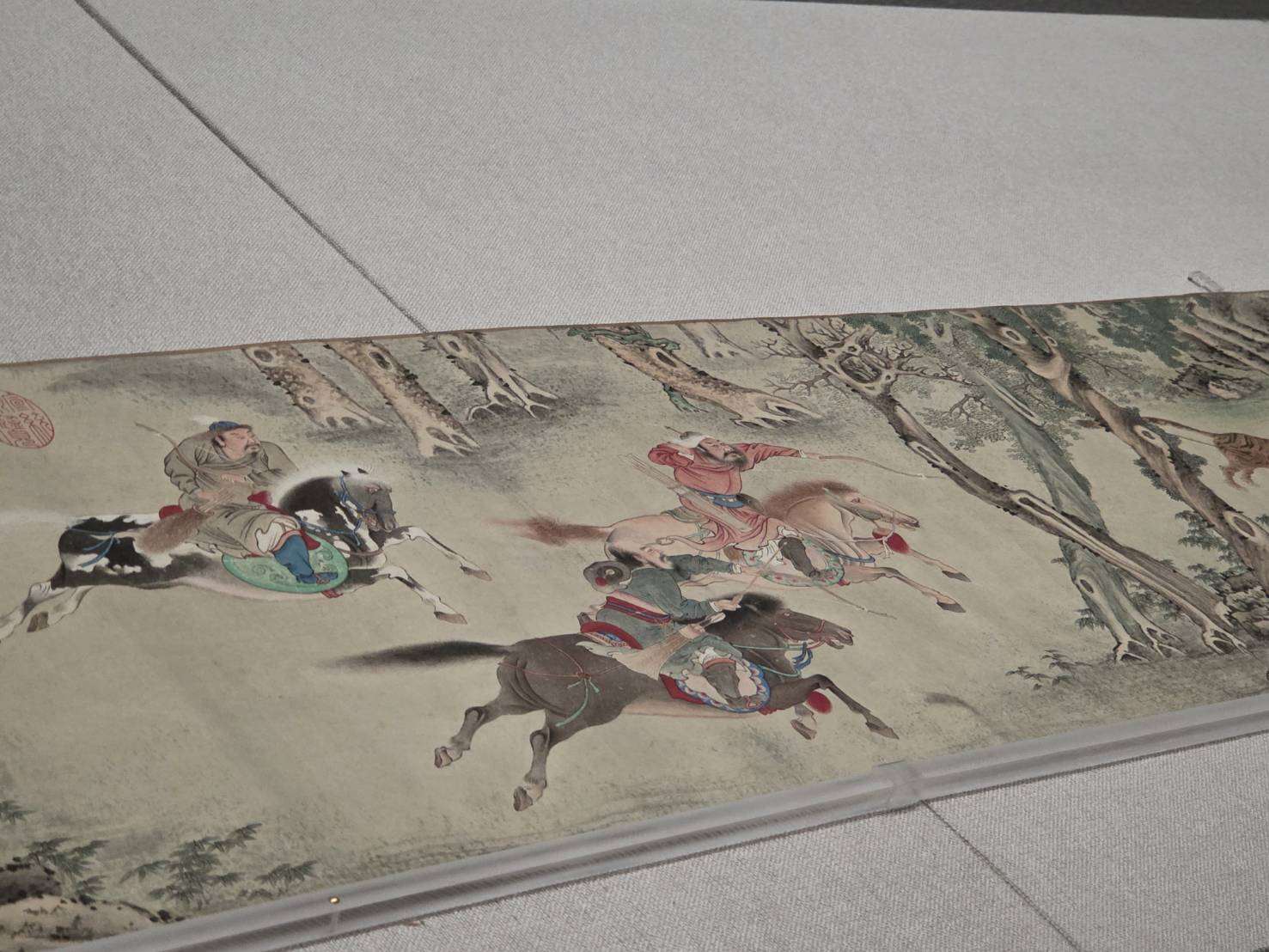 明代仇英《秋獵圖》,描繪8名獵人騎馬穿梭林間追逐獵物,充滿戲劇張力。(江昭倫 攝)