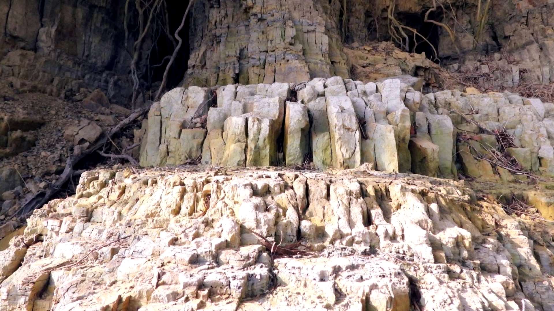 These are not ancient Roman columns, but rather evidence that the water level at Miaoli’s Yongheshan Reservoir is low enough to expose its terraced slope. A local Earth God shrine and the historic Liao family homestead that are normally submerged have also reappeared.