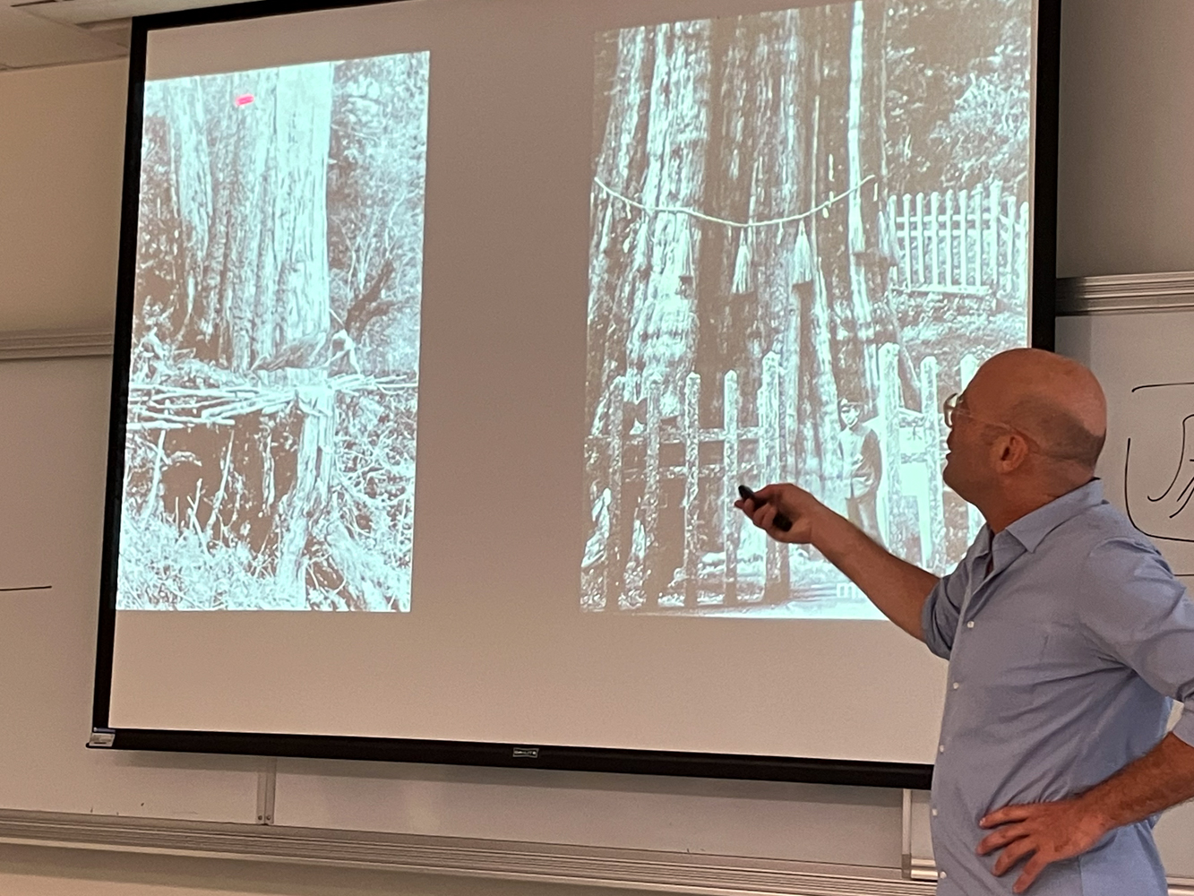 L'historien Jérôme Lanche montre deux photos, l'une d'un colon Japonais qui pose devant un arbre qu'il est en train de couper, l'autre, d'un arbre géant sacré . Au premier abord opposées, ces photos relèvent selon lui du même phénomène de réification de la forêt à Alishan (photo : Sasa)