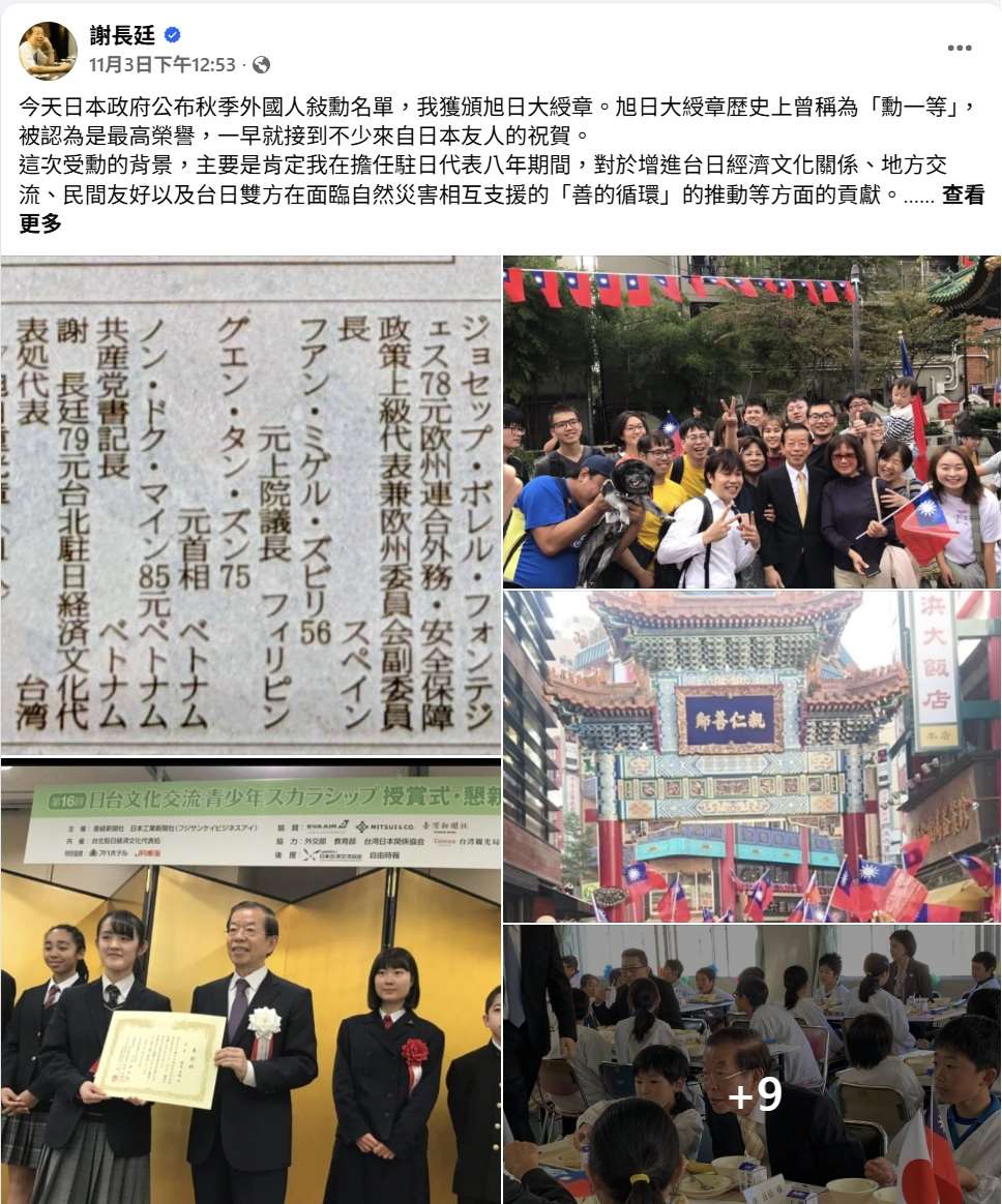 謝長廷氏はSNSで「多くの日本の友人からお祝いのメッセージをいただき、非常に光栄に思う」と述べました。受章は、駐日代表として8年間にわたり、台日間の経済文化関係の促進、地方交流、民間友好、そして自然災害における相互支援の「善の循環」の推進などに貢献したことが評価されたと書きました。