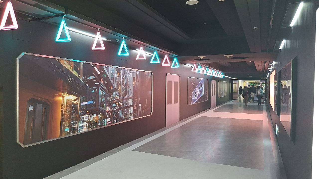 「若さ・多様性・共感」をコンセプトにした西門地下市は、ダークグレーを基調にネオンの光を組み合わせたデザインが特徴です。床には横断歩道や車線を描き、地下都市の街並みを演出。通路のデザインには地下鉄車両のドアや手すり、窓をモチーフにした装飾が取り入れられ、来場者はアニメの世界へ向かう“専用列車”に乗り込むような感覚を味わえます。