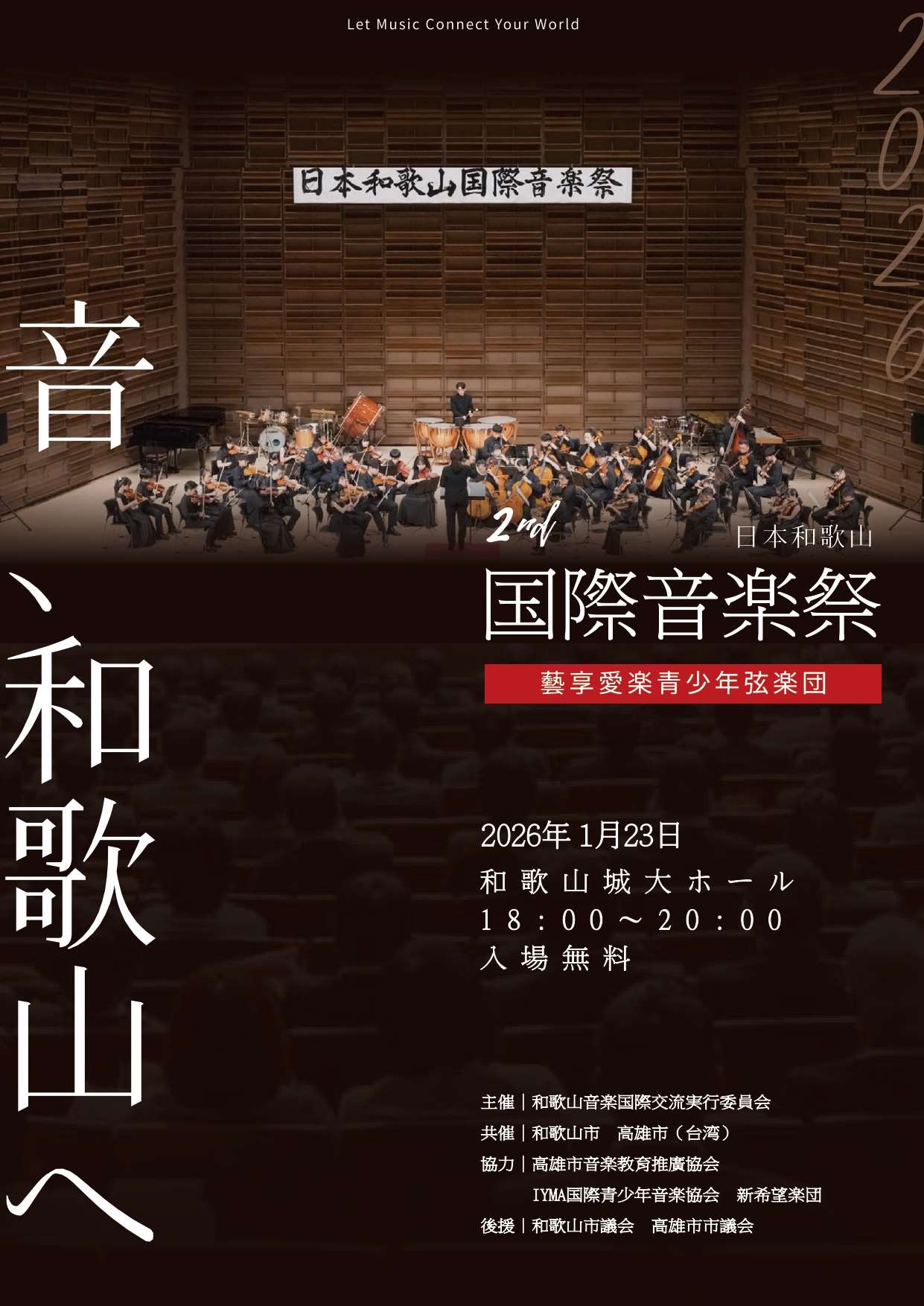 2026年1月23日(金)、日本の和歌山市で行われる国際音楽祭に、台湾の藝享愛楽青少年弦楽団が出演します!