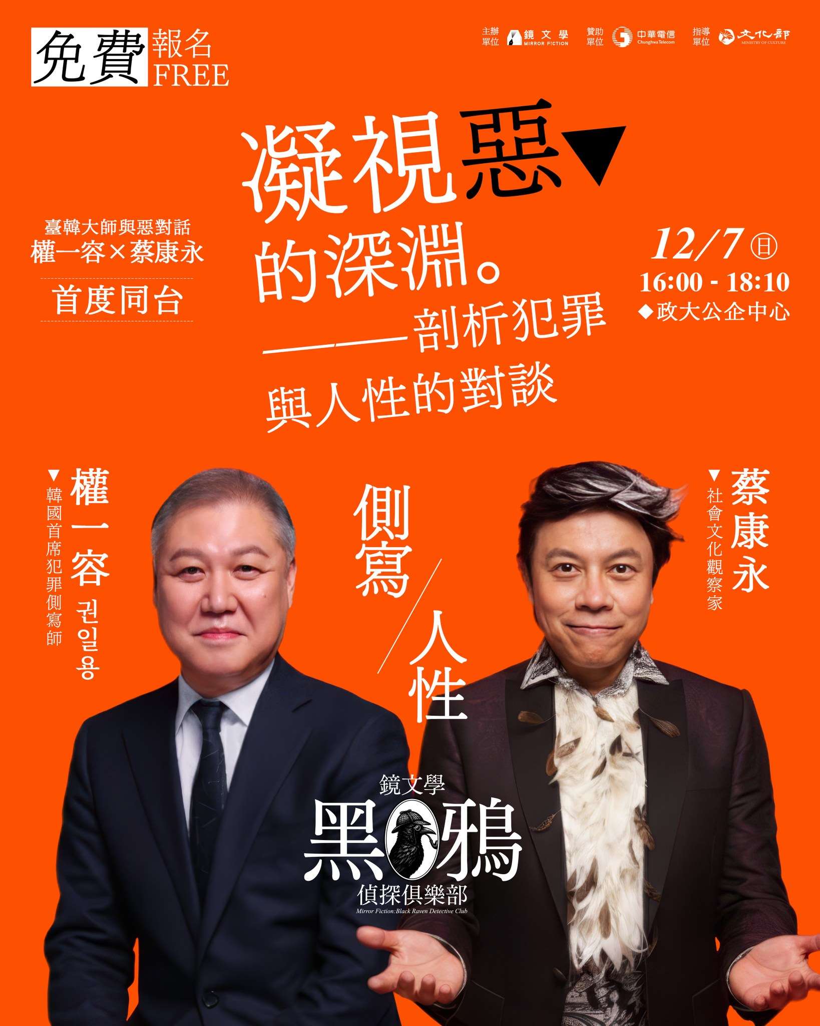 이어 진행된 유명 MC이면서 소설가로 활동하는 차이캉용(蔡康永)과 함께한 강연의 주제는 ‘악의 심연을 응시하다 – 범죄와 인간성을 해부하는 대화(凝視惡的深淵-剖析犯罪與人性的對談)’다. 권 교수와 차이캉용 작가는 ▲타이완과 한국 두 나라에서 사회적으로 큰 방향을 일으킨 실제 사건 ▲우리 일상을 위협하는 범죄유형과 범죄자의 심리에 대해 무료 강연을 진행해 큰 호응을 얻었다.