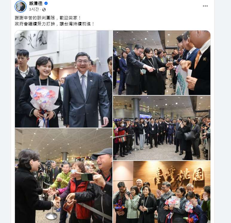 라이칭더 총통 역시 이날 오전 자신의 페이스북을 통해 “수고한 협상단 여러분의 귀국을 환영한다”며 “정부는 타이완이 끊임없이 전진할 수 있도록 노력할 것”이라고 환영의 뜻을 전했다.