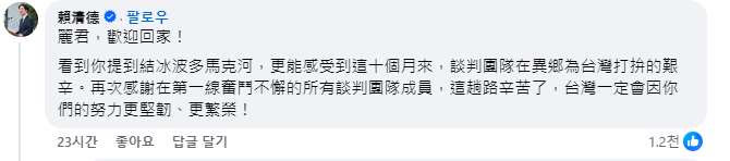 ▲정리쥔 행정원 부원장의 게시글에 라이칭더 총통이 남긴 댓글. [사진출처 = 정리쥔 중화민국 행정원 부원장 페이스북]