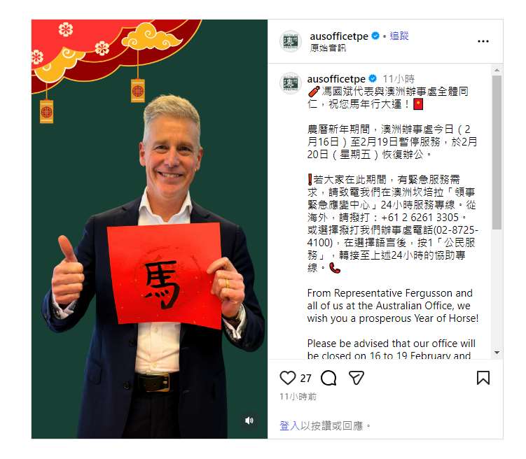 로버트 퍼거슨(Robert Fergusson) 주타이완 호주 대표는 직접 붓을 들었다. 퍼거슨 대표는 호주주타이완판사처(澳洲駐台辦事處, Australian Office in Taipei) 공식 인스타그램 영상에서 서툰 솜씨지만 정성을 다해 ‘말 마(馬)’자를 써 내려가며 ‘춘리엔(春聯)’을 완성했다. 퍼거슨 대표 역시 유창한 중국어로 “서예 실력은 부족하지만 마음만큼은 진심”이라며, “모두가 뜻하는 바를 즉시 이루는 마도성공(馬到成功)의 한 해가 되길 바란다”고 축복했다.