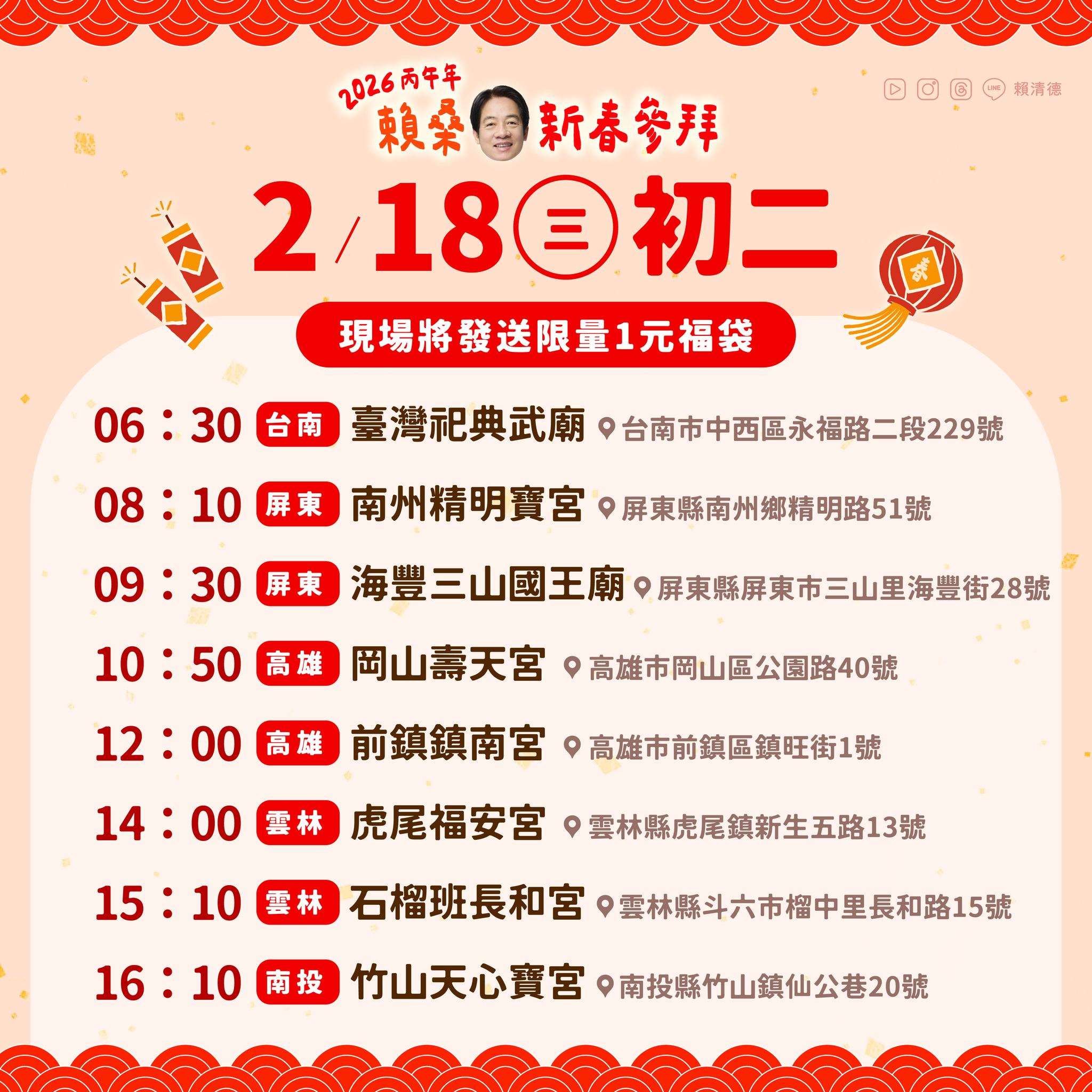 ▲2026년 2월 18일(수), 병오년(丙午年) 춘절 대초이레(大年初二)를 맞아 진행되는 라이칭더 총통의 사찰 참배 및 복주머니 배부 일정. [사진출처= 라이칭더 총통 페이스북]