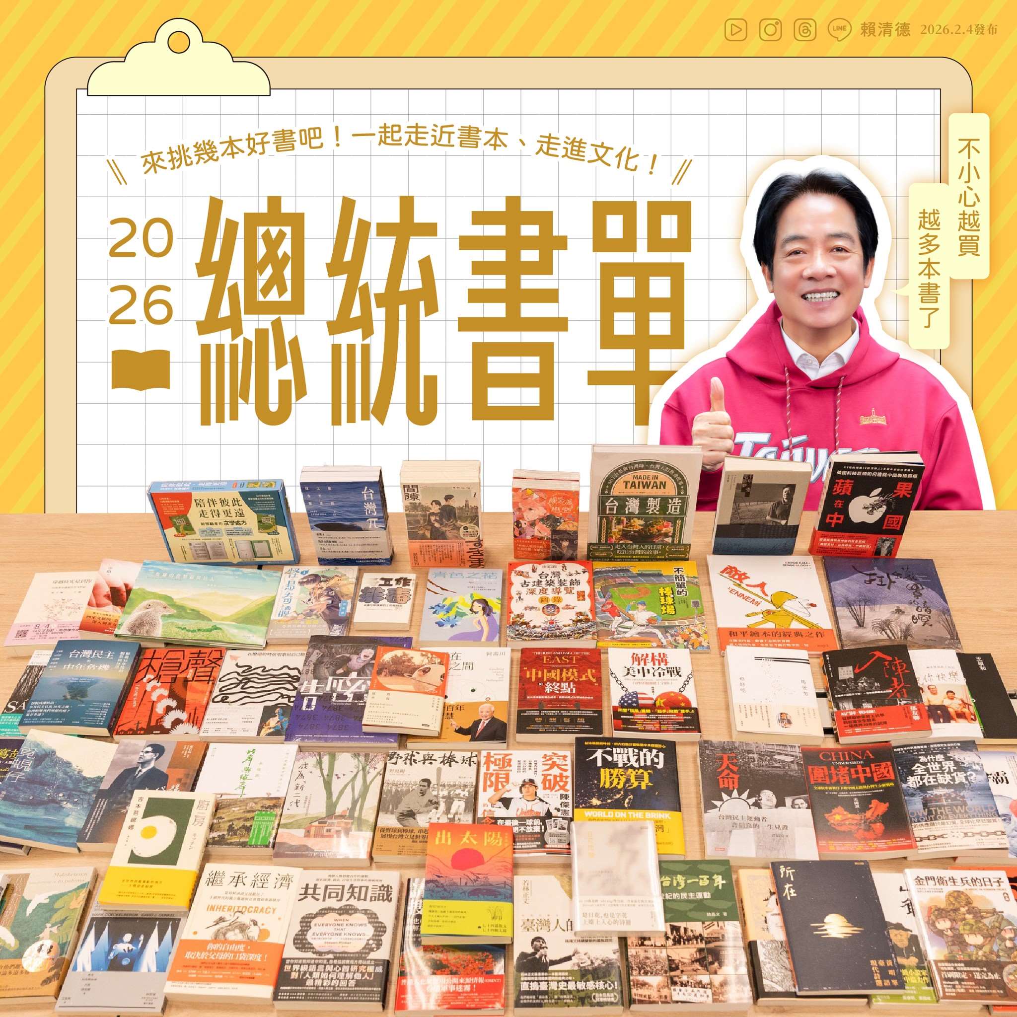 라이칭더 총통이 2026 타이베이국제도서전에서 구입한 책들 - 사진: 라이칭더 페이스북