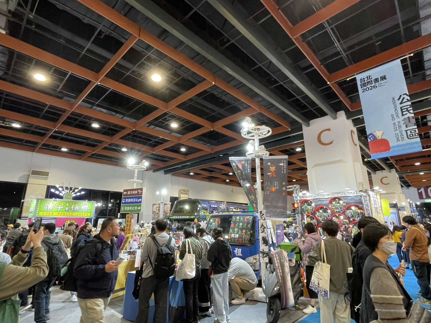 테마관 외에도 눈길을 끄는 공간들이 많았는데, 이중에서도 특히 독립서점과 개인 창작자들이 모인 ‘시민 코너’가 깊은 인상을 남겼습니다. 이 코너는 신호등와 횡단보도, 점자블록, 빈랑가제, 트럭과 오토바이, 관광버스까지 타이완의 거리 풍경을 행사장으로 그대로 옮겨왔습니다. 특히 관광버스 안에서는 실제로 70여 개가 넘는 포럼과 행사가 진행되었고, 단순한 전시 공간을 넘어, ‘공간을 어떻게 상상할 수 있는지’를 보여주는 실험적인 시도였으며. 독자들은 버스 좌석에 앉아, 마치 여행을 떠난 것처럼 다양한 이벤트를 즐길 수 있었습니다.