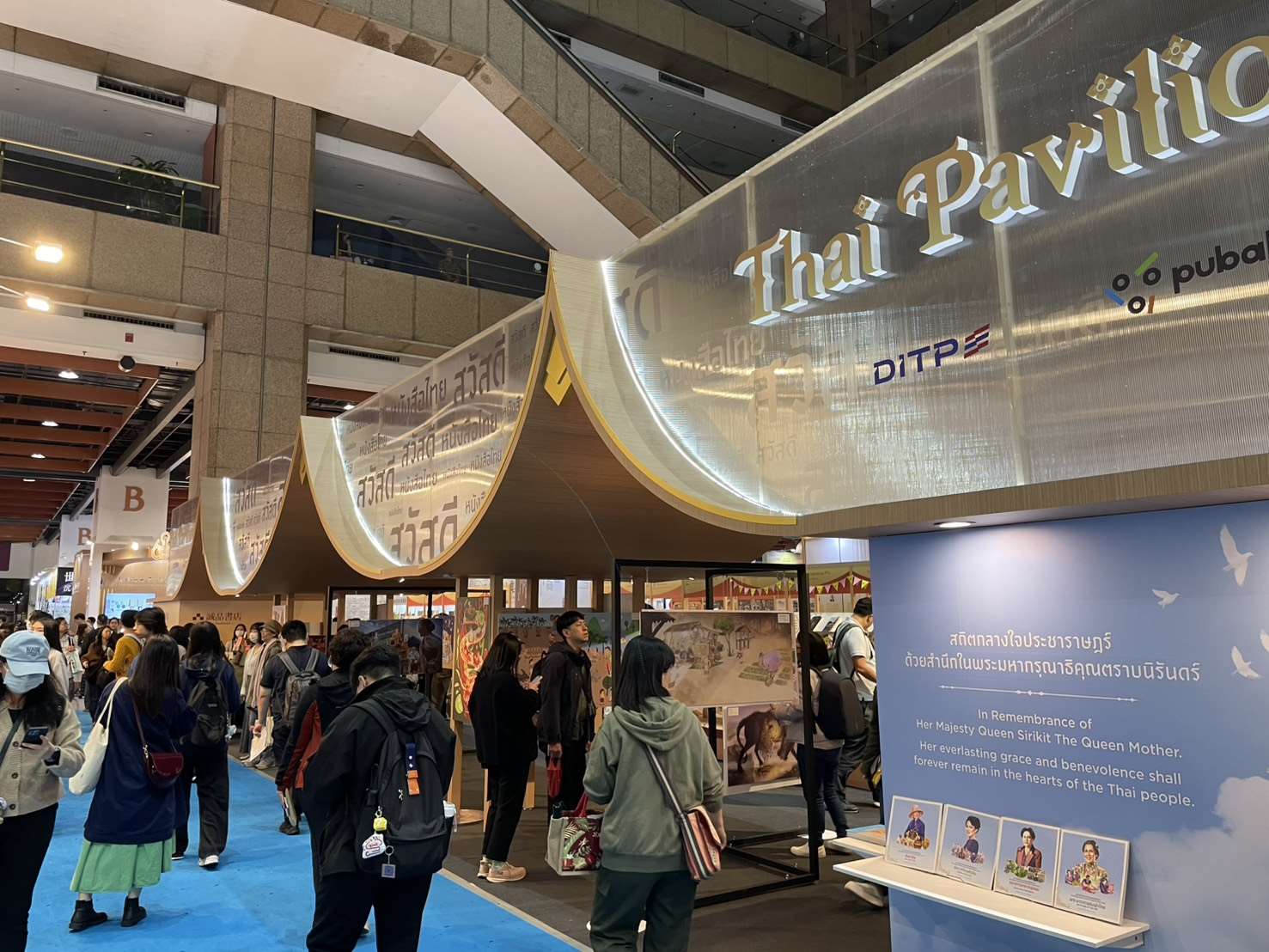 올해 도서전의 주빈국은 ‘미소의 나라’로 알려진 태국입니다. ‘태국식 크리에이티브 라이프’를 주제로, 태국 창작자들이 일상의 경험과 지역의 풍경을 바탕으로 태국을 어떻게 표현하는지에 초점을 맞췄습니다. 테마관 현장에는 커다란 태국 지도가 설치되어 있었는데, 전시 도서는 지도 위치에 따라 방콕 작가, 북부 작가, 남부 작가로 나뉘어 전시되어 있어, 마치 태국 여행 가이드처럼 보였습니다. 또한 태국 궁궐을 모티브로 한 공간에는 지난해 말 별세한 시리낏 왕태후(Queen Sirikit)를 기념하는 코너도 마련되며, 왕태후가 생전에 예술과 문학 발전에 기여한 업적을 되새겼습니다.