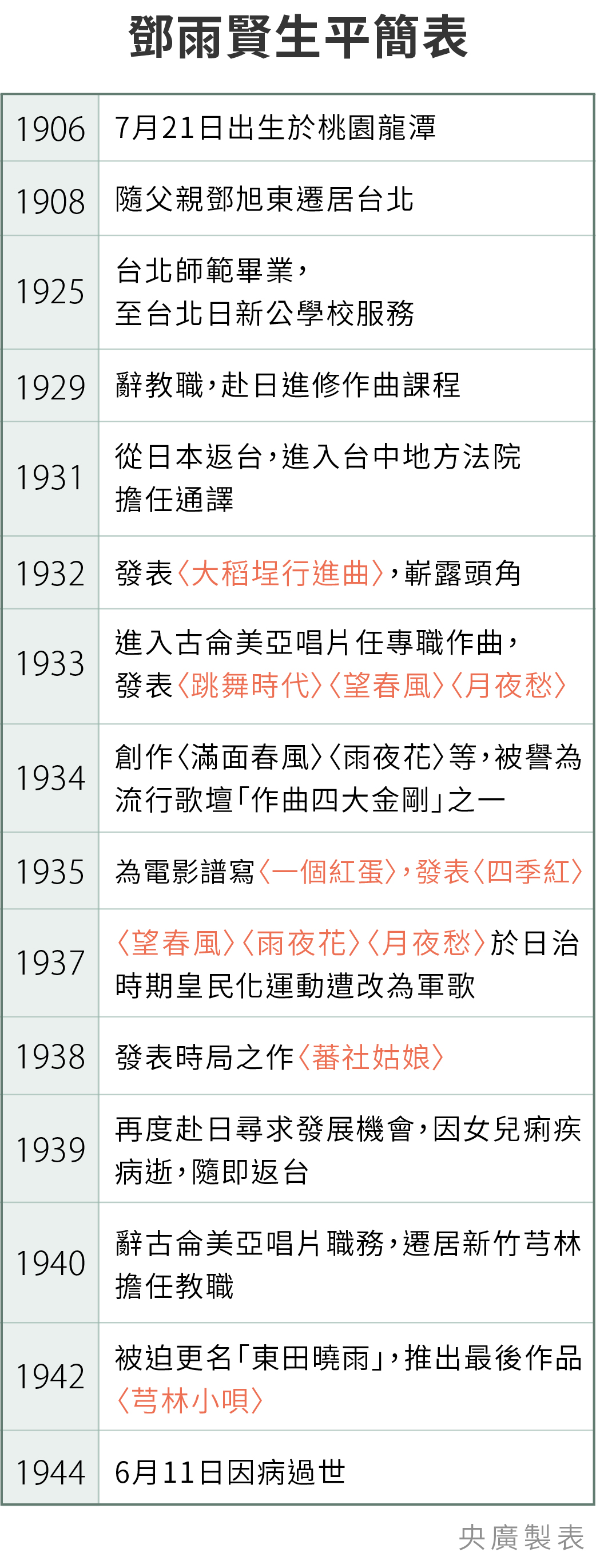 回顧鄧雨賢的一生,只有短短39年生命,然而他東西方交融、獨到的音樂創作手法,共譜寫出包括「四季紅」、「月夜愁」、「望春風」及「雨夜花」等近百首作品,即使到了今天依然歷久彌新,在國內外傳唱不已。