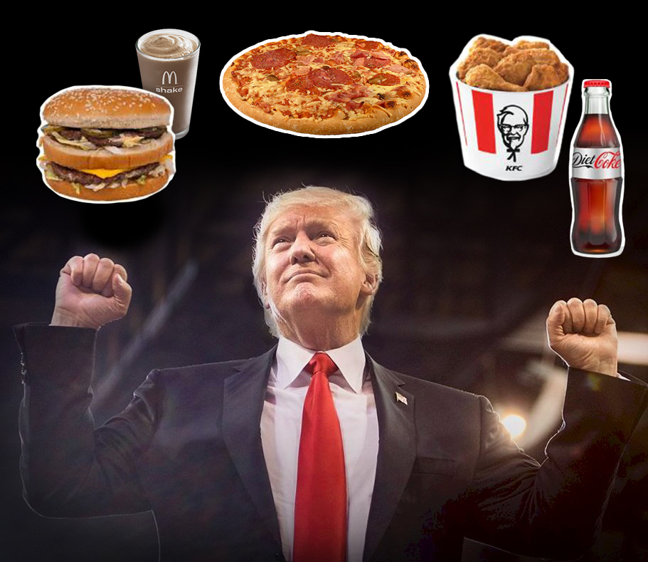 到底川普有多愛吃速食?川普的前競選經理李萬度斯基(Corey Lewandowski)和博西(David Bossie)曾出書爆料,川普競選專機上有四大常見「美食」:麥當勞、肯德基、披薩和健怡可樂(Diet Coke)。而川普的晚餐外帶菜單,竟然是兩個大麥克、兩個麥香魚堡,再來一份巧克力雪克。至於針對川普的各式報導,也常見他的桌上出現大份量的肯德基全家餐。