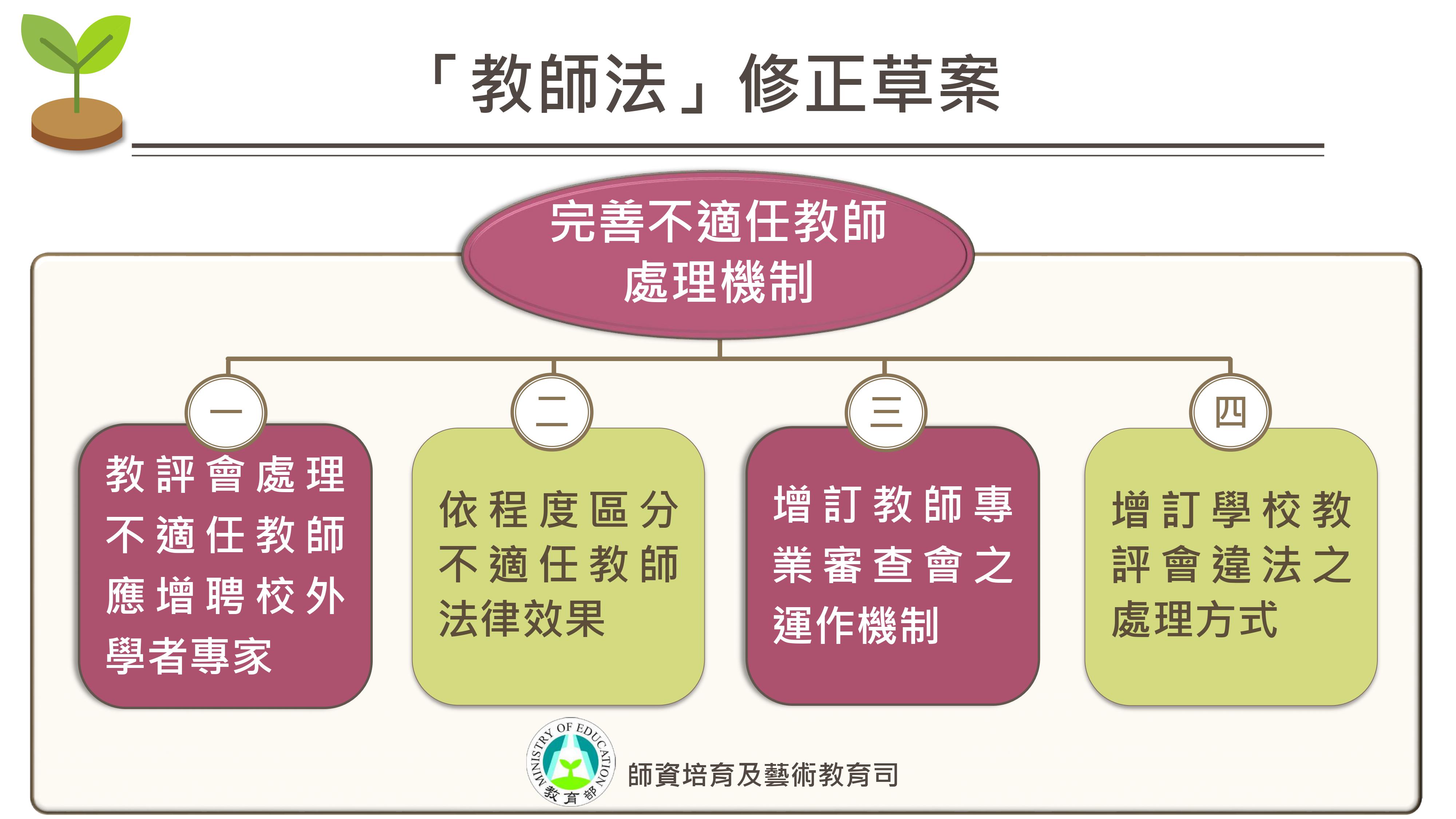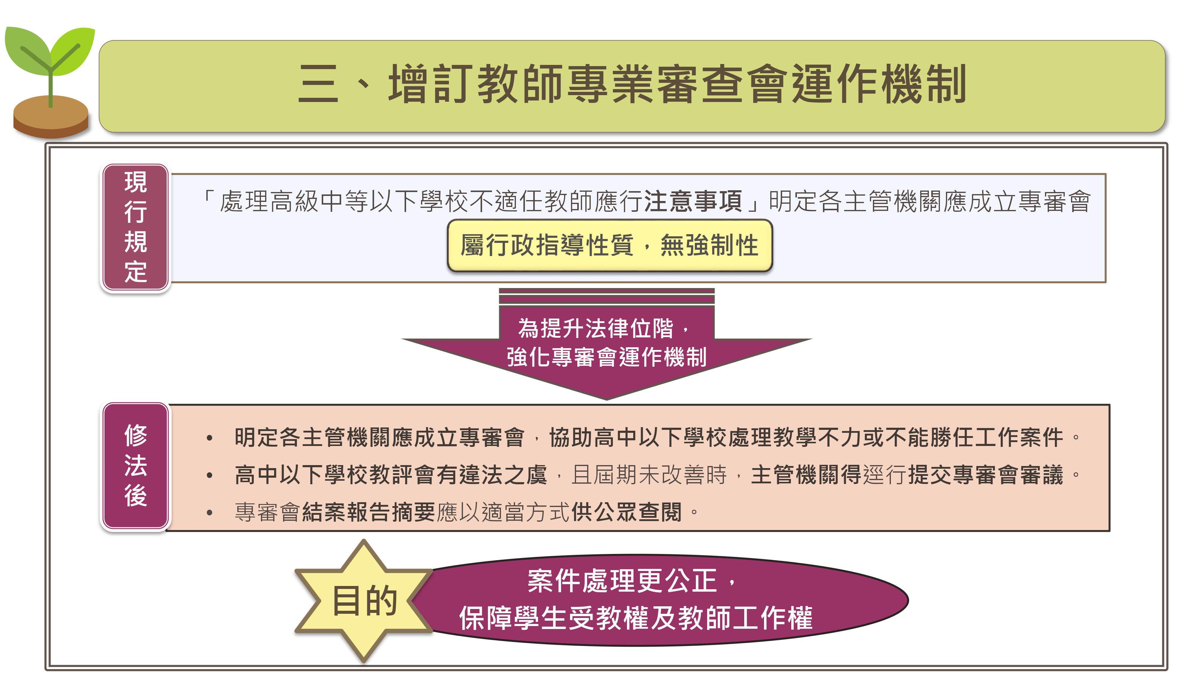 草案也將原本只具有行政指導性質的教師專業審查會提升至法律位階,增訂各級主管機關應成立教師專審會,藉由客觀、專業、中立的第三方協助高中以下學校處理不適任教師案件。