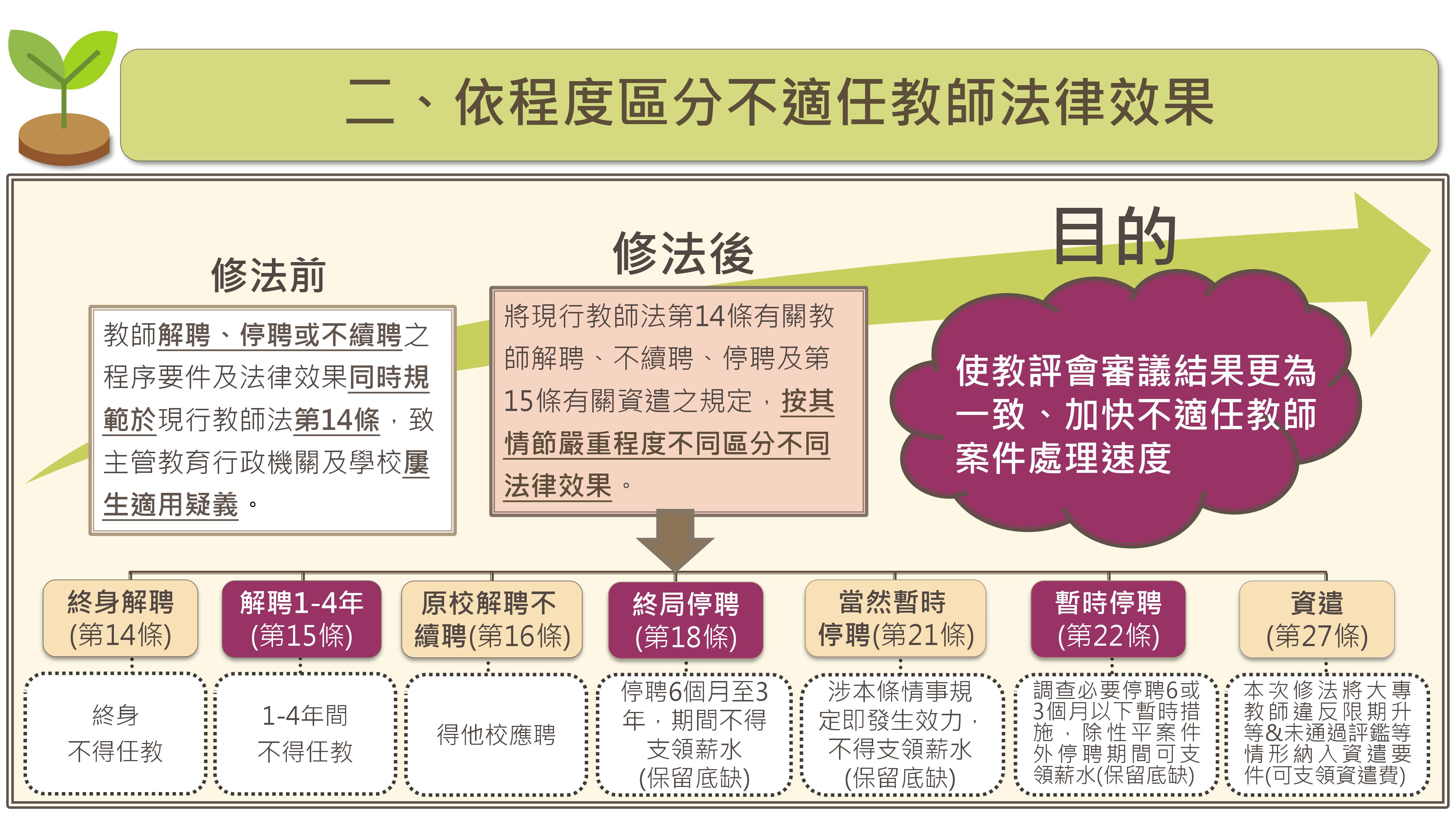 行政院會7日通過「教師法」部分條文修正草案,完善不適任教師的處理機制。草案修改第14條、第15條、第16條、第18條、第21條和第22條,將原本不適任教師解聘、不續聘、停聘的處置樣態,依照情節輕重程度不同細分為7種,包括終身解聘、解聘1至4年、解聘或不續聘且不得在原校任教、終局停聘、當然暫時停聘、暫時停聘與資遣,讓各校教師評審委員會審議結果更為一致。