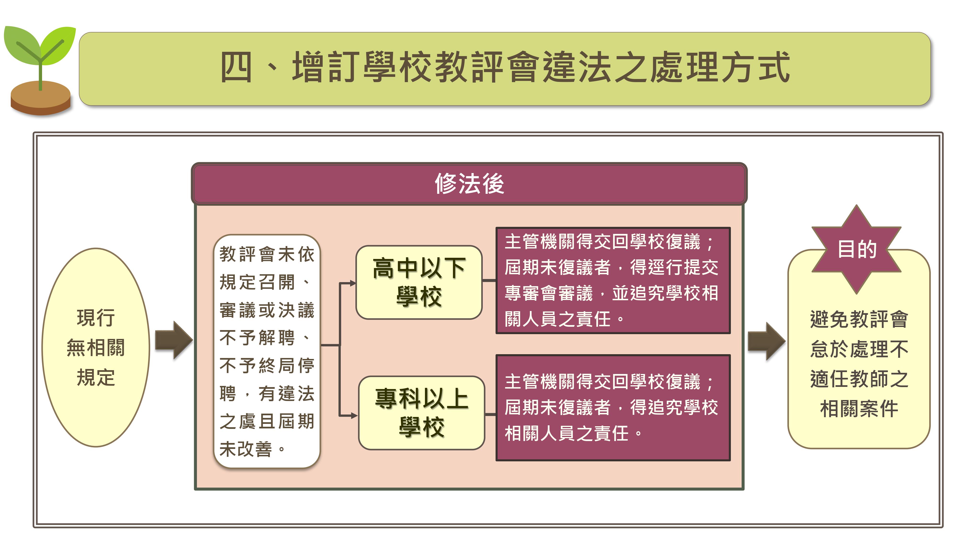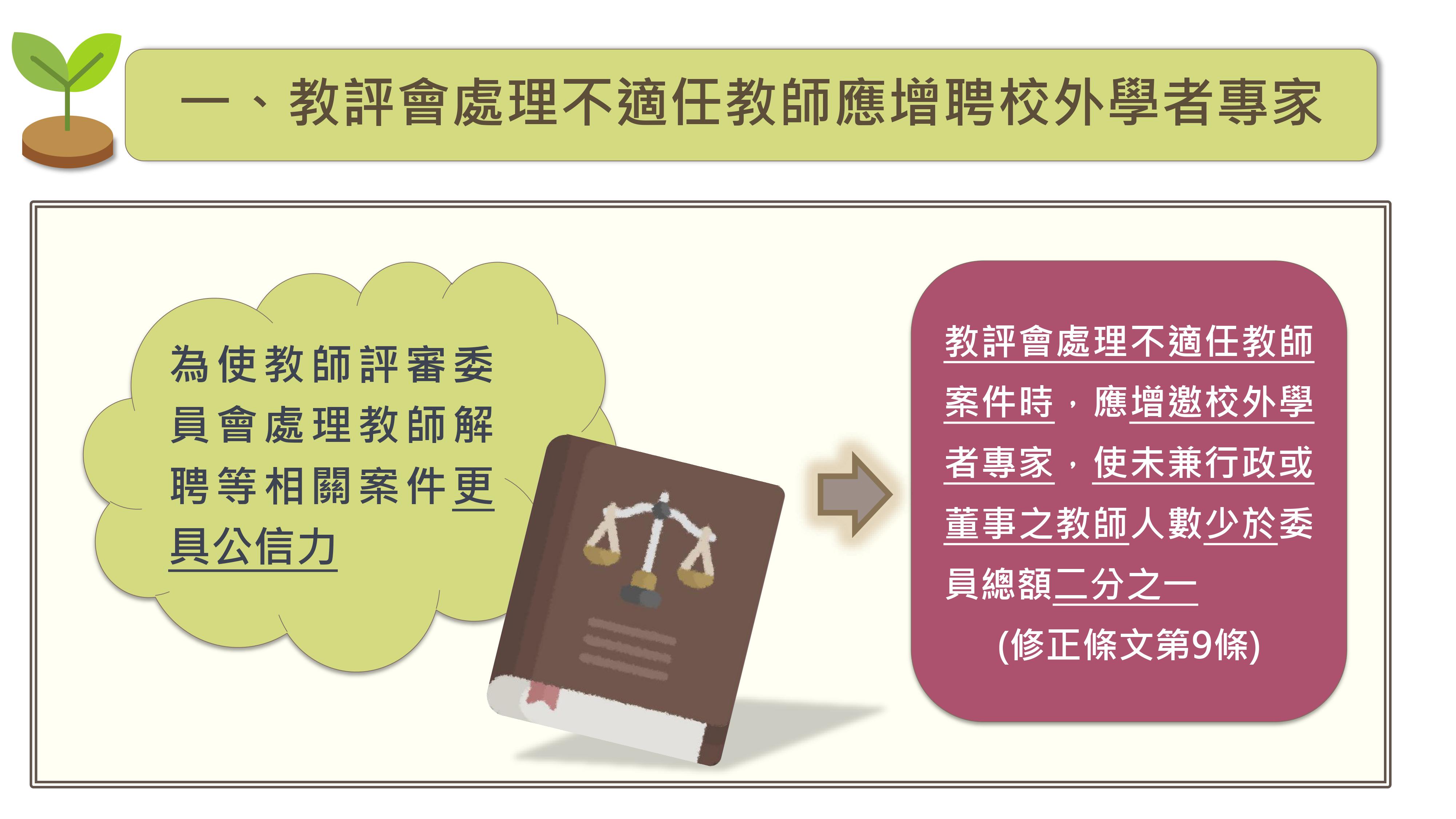 為了避免老師在教評會有壓力,這次修法也調整教評會在處理不適任教師案的結構,須增聘校外專家學者擔任委員,教師代表比例降至二分之一以下。教育部師資培育及藝術教育司長鄭淵全說:『(原音)這樣的話可以舒緩壓力,可以提供公平、公正機會,這是修法有關學校教評會的調整。第二,修法之前第14條規定較為模糊,這次修法後把解聘、停聘、不續聘,一直到資遣分成7種不同狀況,就會有很明確處理方式。』