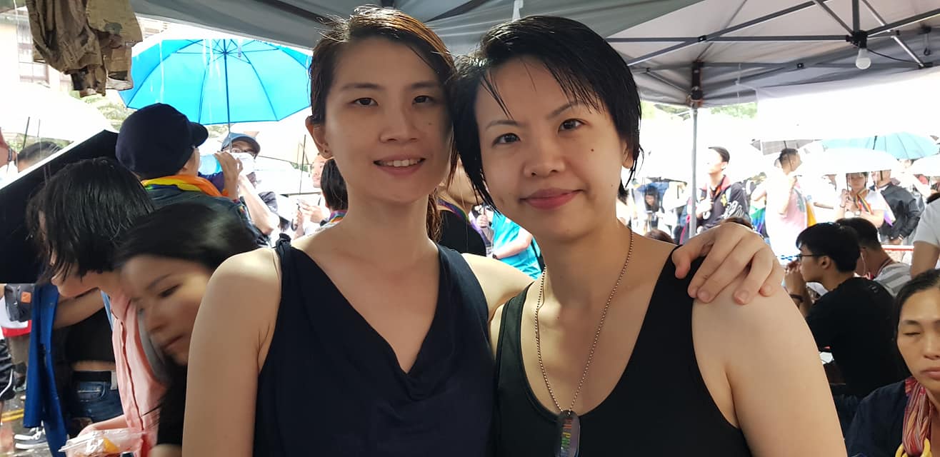 林巧筑(左)帶著來自香港的女友欲辦結婚登記遭拒,盼台灣早日開放跨國同婚。(歐陽夢萍 攝)