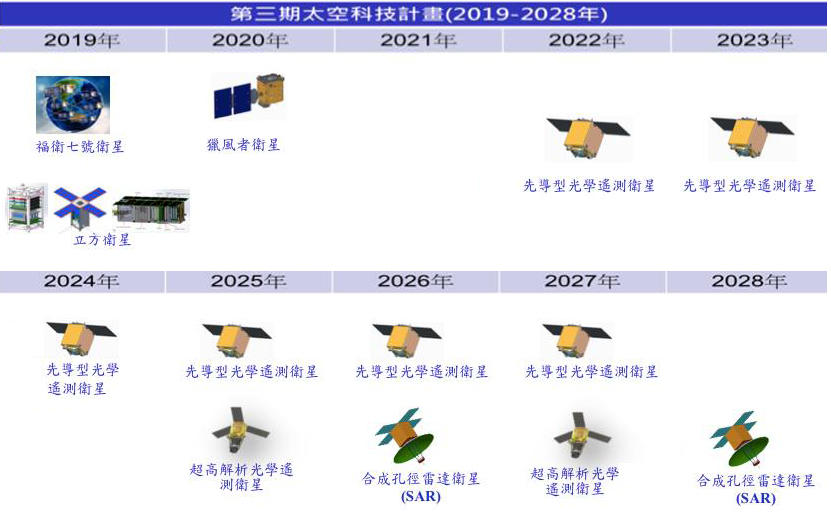 「第三期太空科技長程發展計畫」則是自2019年執行至2028年,預計投入251億元,發展6枚「先導型高解析度光學遙測衛星」、2枚「超高解析度智能遙測衛星」及2枚「合成孔徑雷達衛星」。