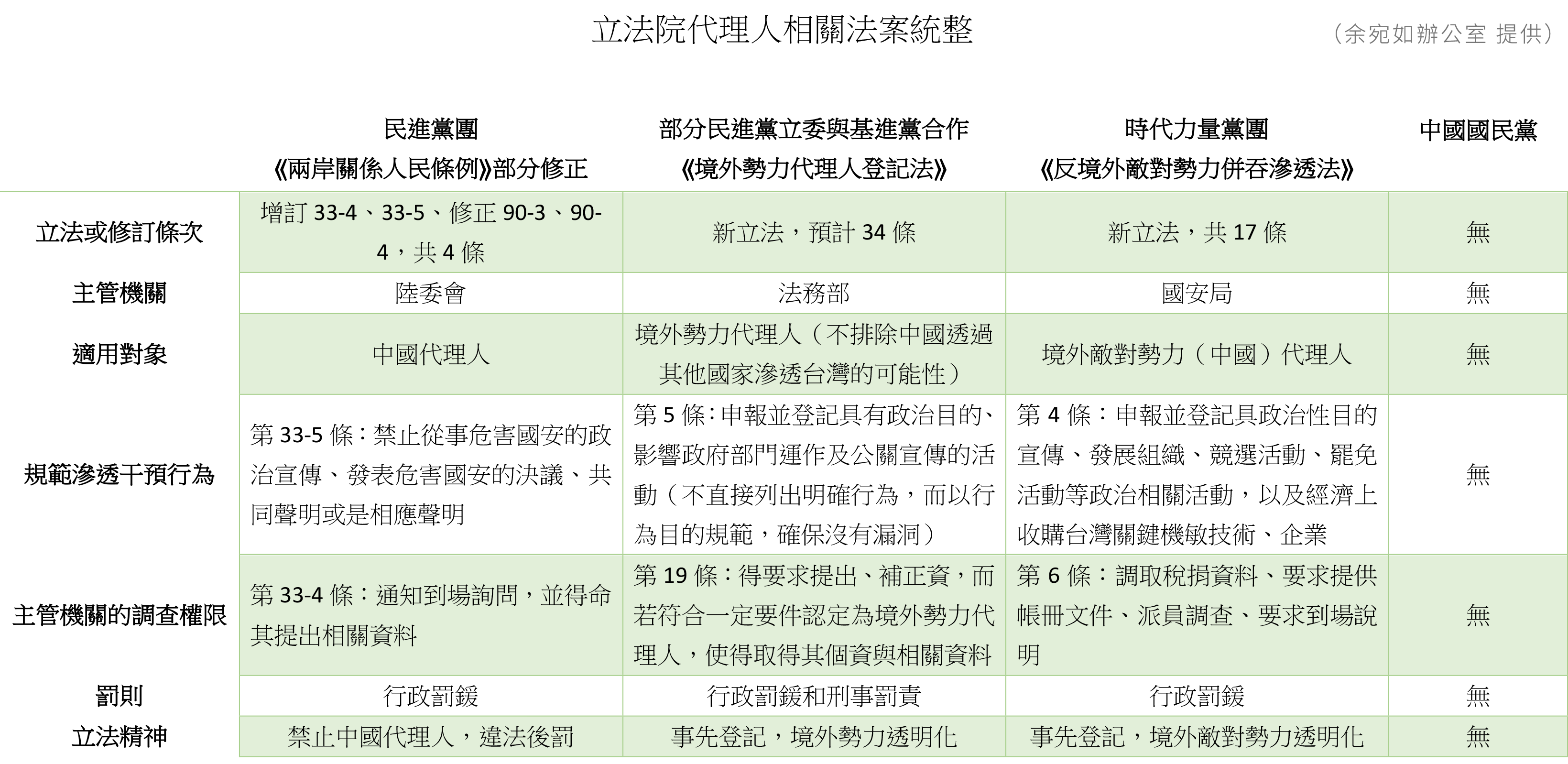 為解決中共紅色滲透台灣,民進黨將在下個會期將修訂「中共代理人」修法,目前除了民進黨團版的「兩岸人民關係條例」與時代力量黨團版的「反境外敵對勢力併吞滲透法」待審外,民進黨立委余宛如也與基進黨合作,提出「境外勢力代理人登記法」。余宛如強調,她的版本適用對象不僅「中國代理人」,還規範了其他國家滲透台灣的可能性,更納入刑事罰則,將更能全面強化防衛性民主。