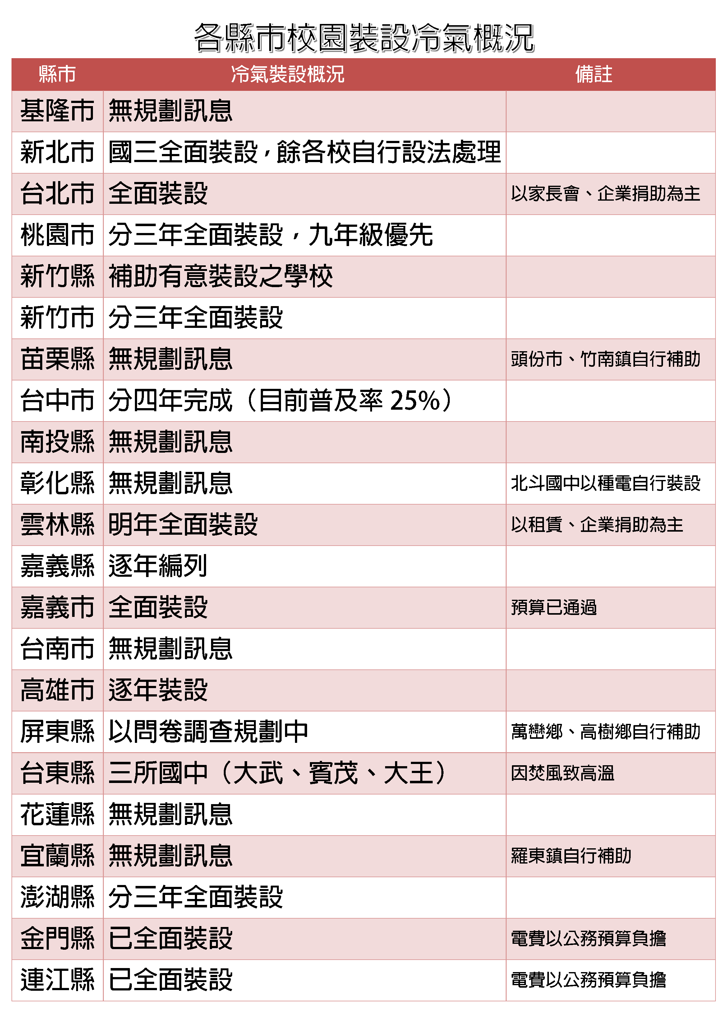 各縣市學校裝設冷氣的情況大不同,全教總分析,有的縣市宣示全面裝設或局部裝設,有的尚無規劃,金門和連江縣的情況最好,全縣學校教室都有裝冷氣,且由公務預算支應電費。