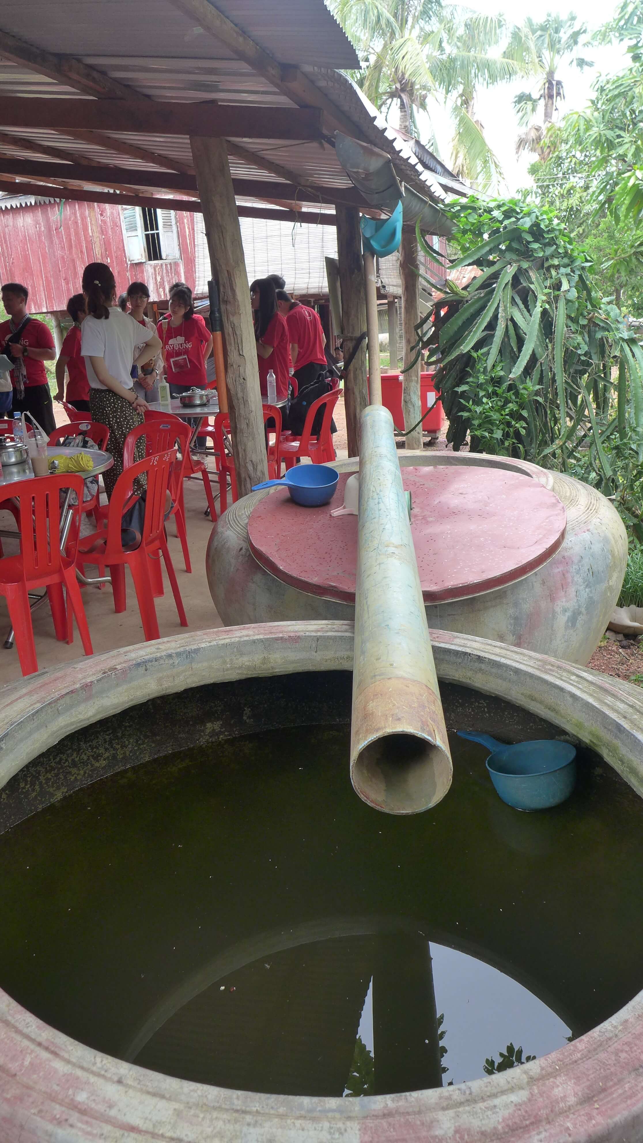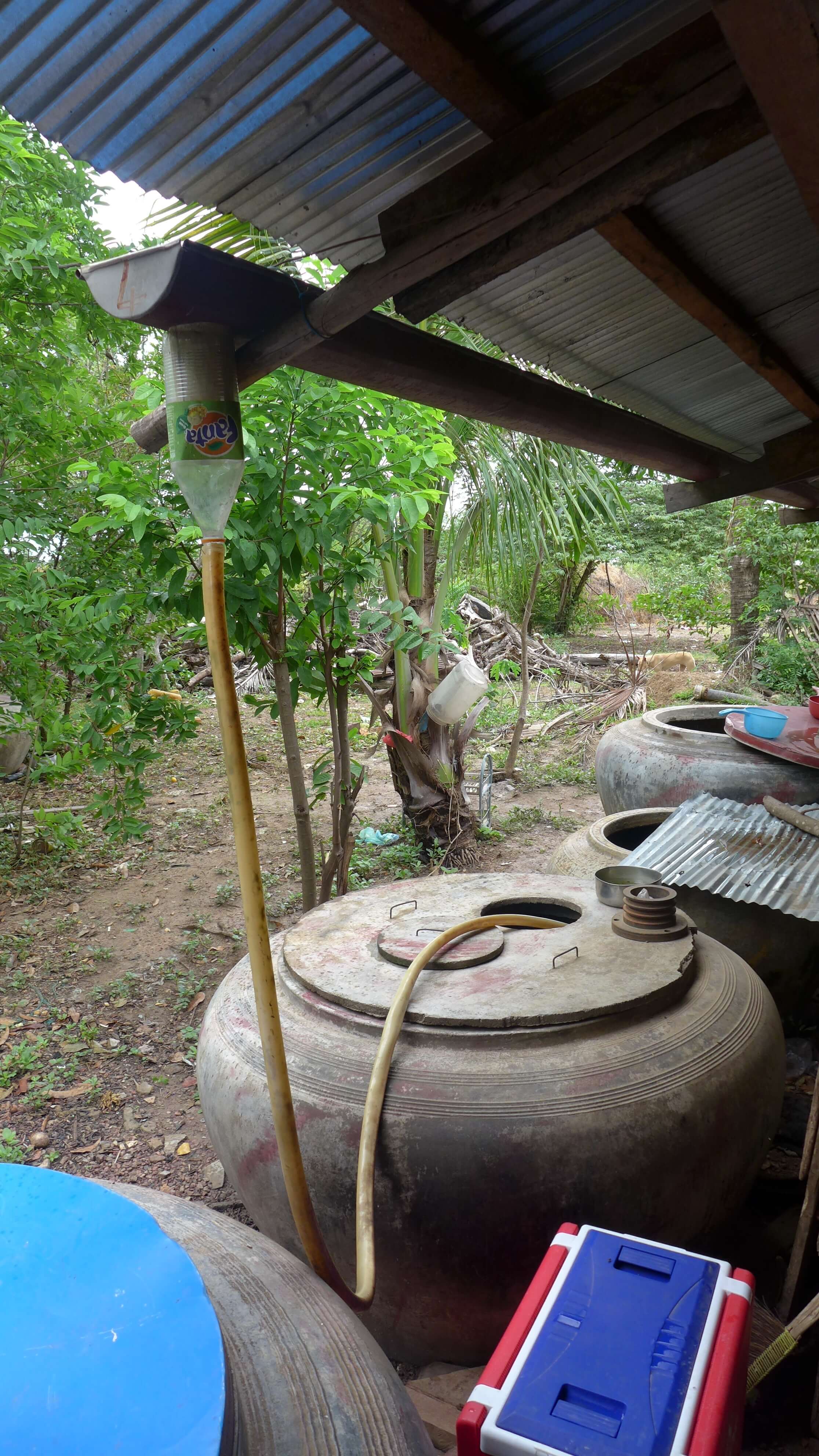 柬埔寨偏鄉居民從屋簷接管子,將雨水引入大水缸。(陳國維 攝)