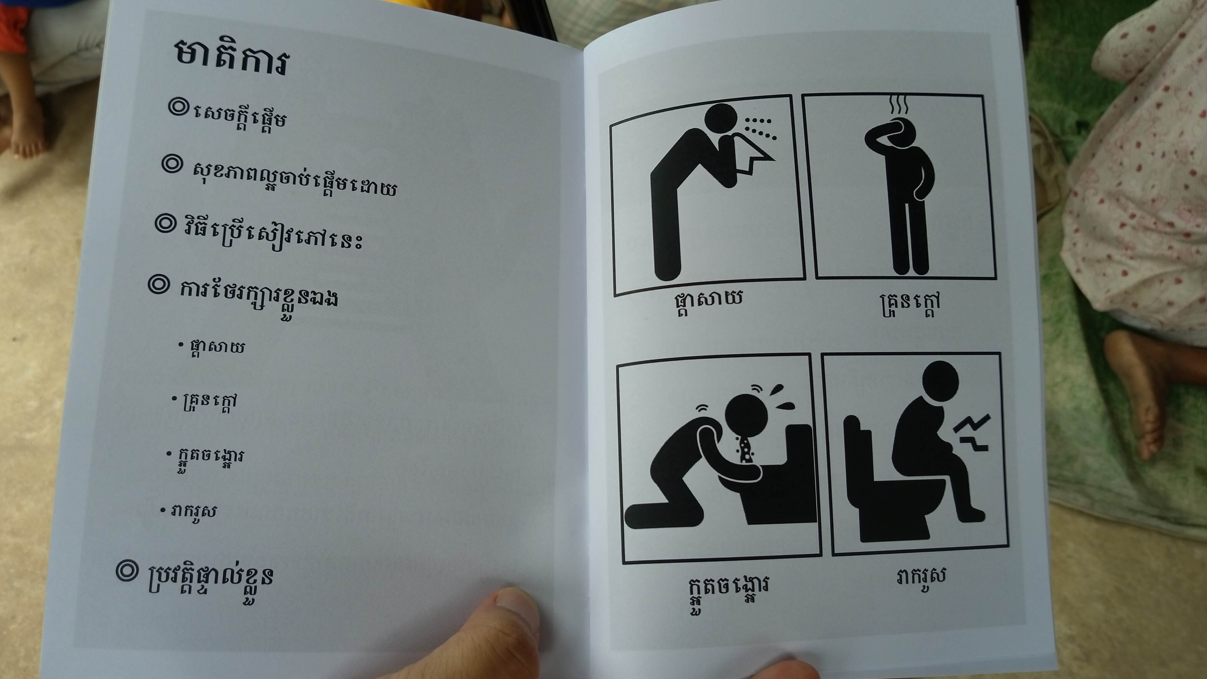 台灣學生自編印有柬埔寨文的「症狀處理手冊」。(陳國維 攝)
