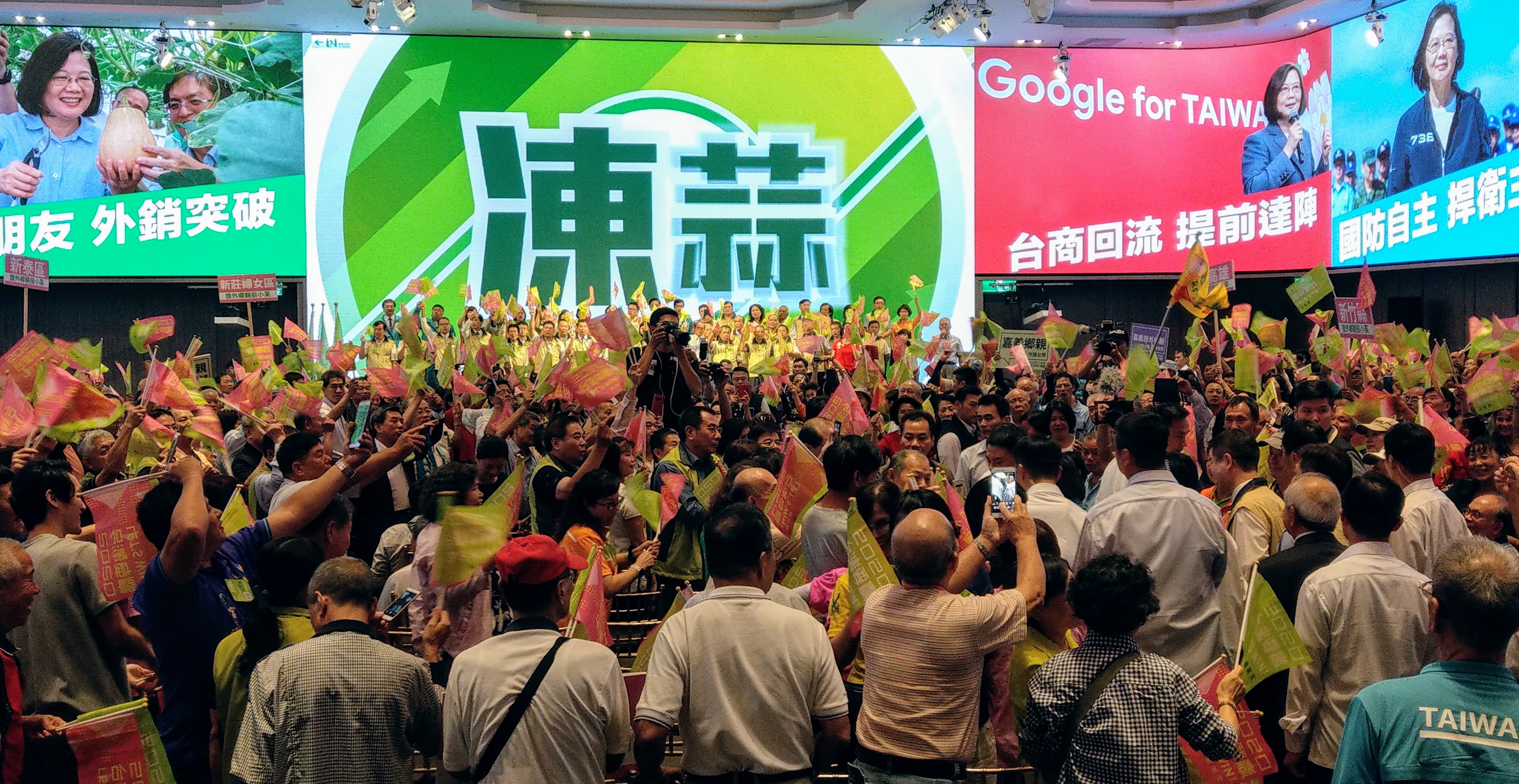 蔡總統步入會場時,受到近千名鄉親熱情歡迎,現場旗海飄揚、凍蒜聲不斷。(劉品希 攝)