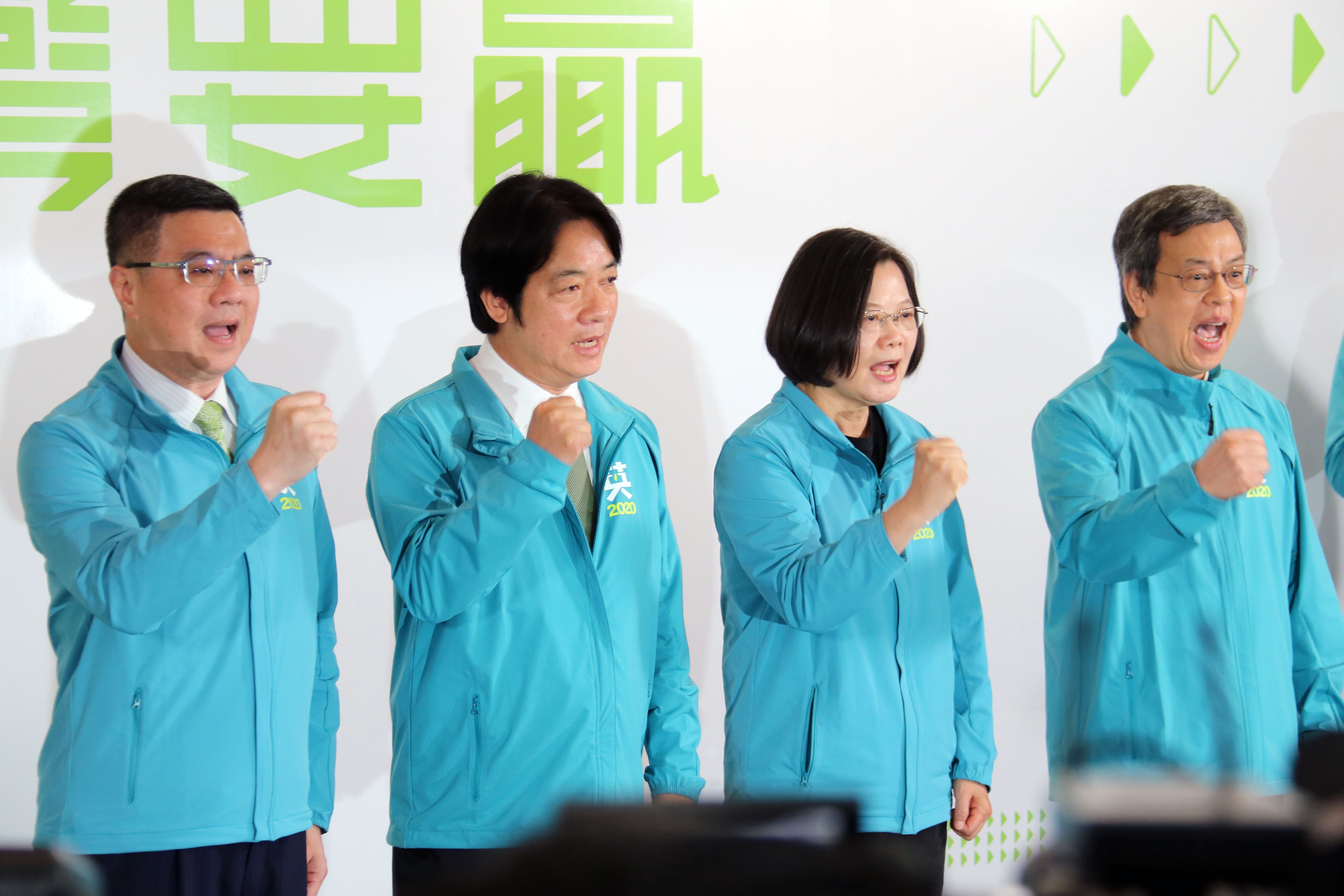 蔡英文總統(右二)、賴清德(左二)、副總統陳建仁(右一)及民進黨主席卓榮泰(左一)共同宣示要力拚總統勝選、國會過半。(歐陽夢萍 攝)