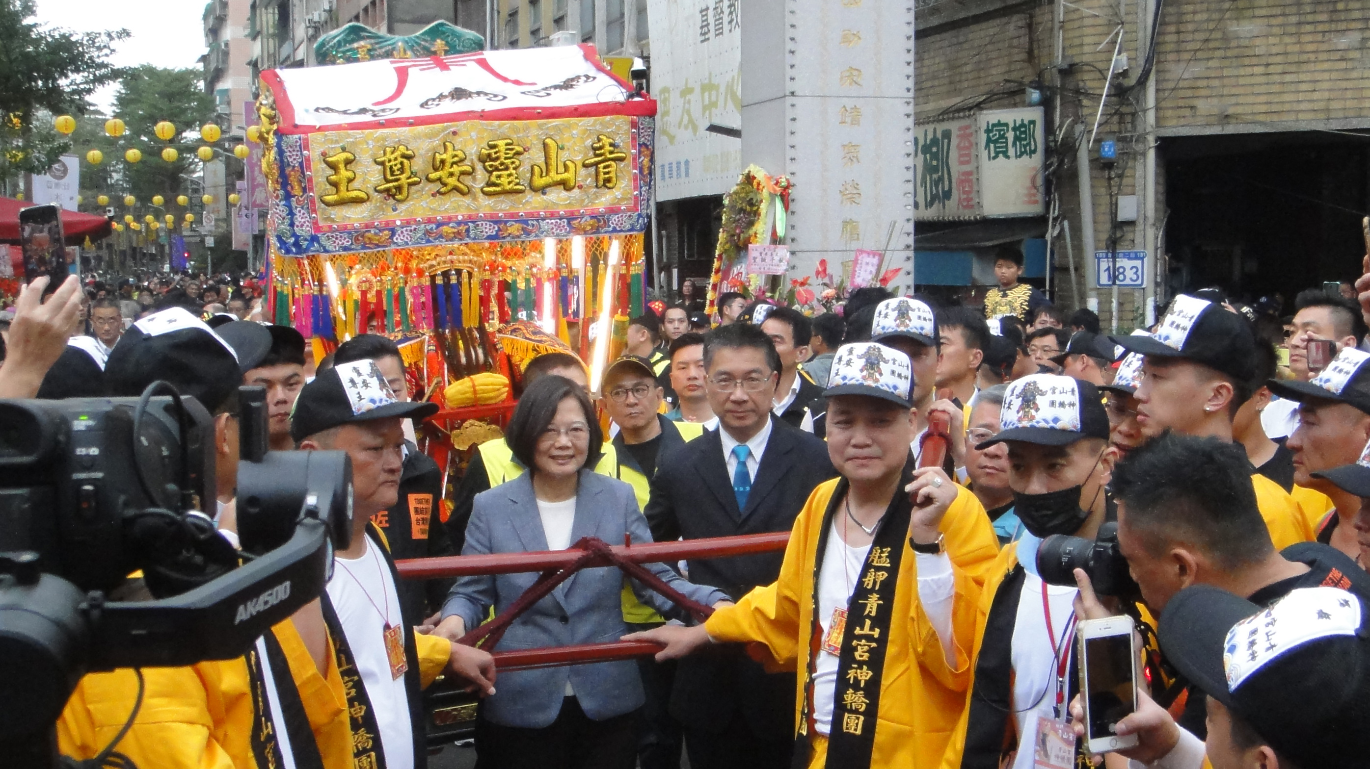 蔡英文總統18日參與台北艋舺青山宮靈安尊王聖誕千秋遶境扶轎活動,並擔任扶轎官,迎神起轎。