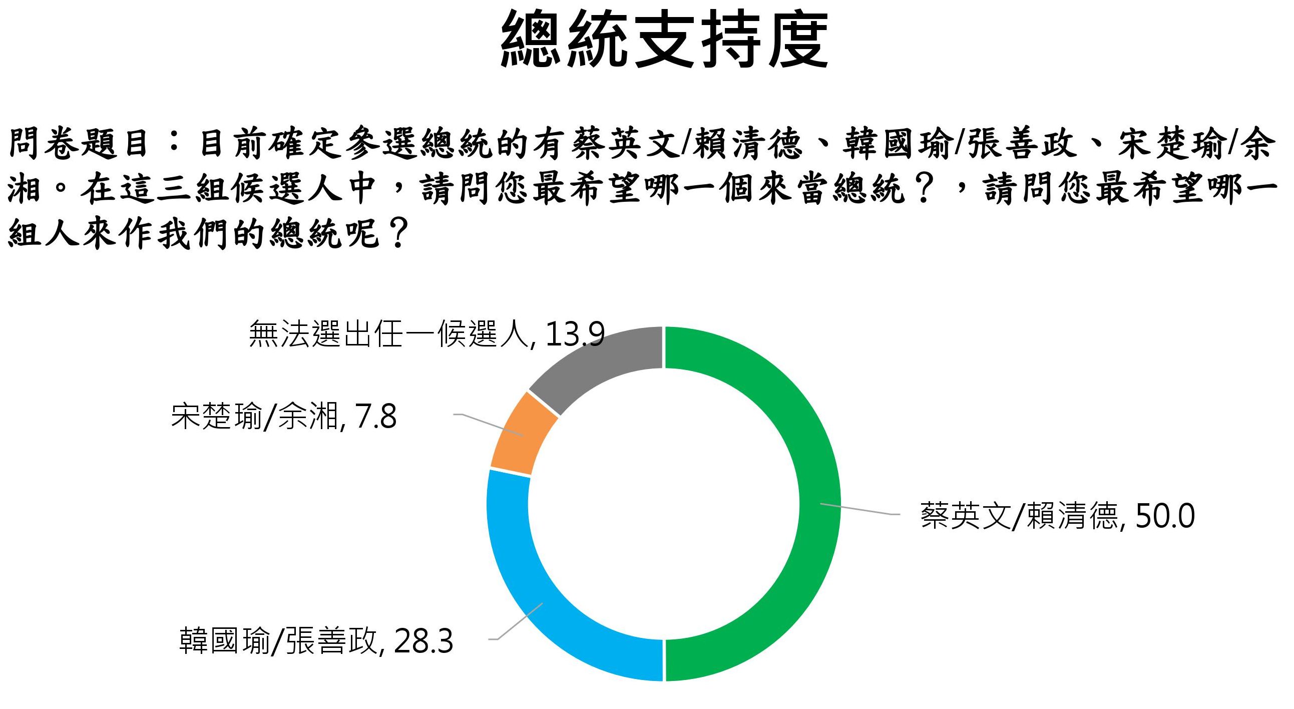 兩岸政策協會26日公布民調,在2020總統大選支持度方面,「英德配」獲得50%的支持度、「國政配」是28.3%、「宋余配」有7.8%。(王韋婷攝)