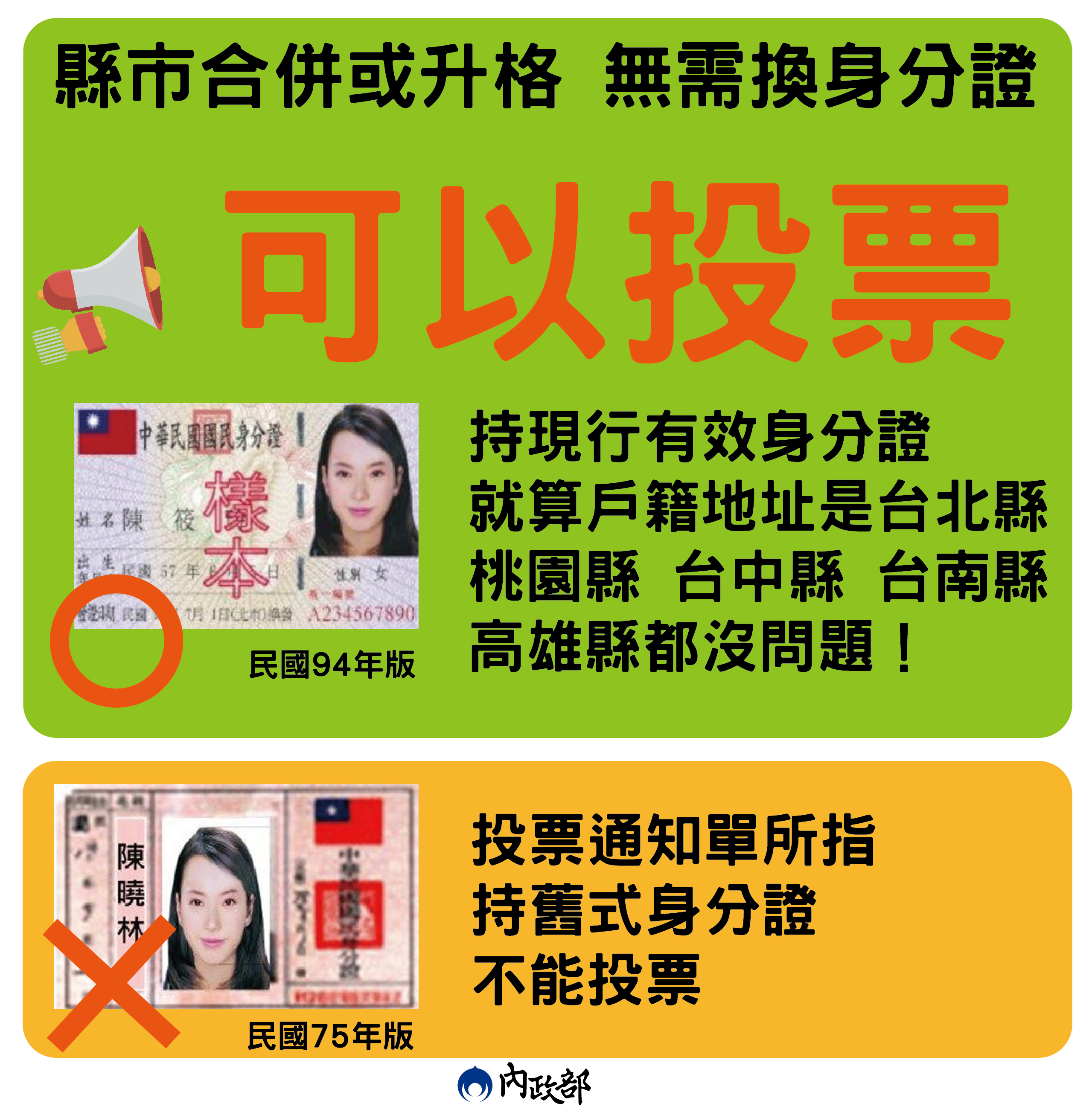 內政部7日表示,縣市合併或升格無需換身分證,仍可投票。(內政部提供)