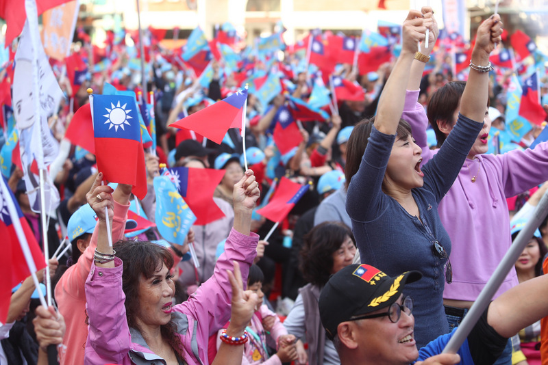 2020大選前最後一個黃金週日,國民黨總統候選人韓國瑜5日下午現身新北市板橋區造勢會場,大批支持者搖旗吶喊,熱情迎接。(圖:中央社)
