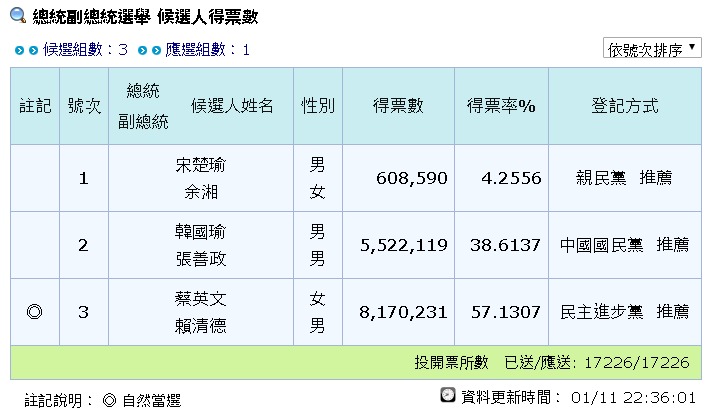 至於對手國民黨正、副總統候選人韓國瑜、張善政得到552萬2,119票,得票率38.6%,較4年前「朱王配」多了170萬票;親民黨正、副總統候選人宋楚瑜、余湘拿到60萬8,590票,得票率4.3%,較4年前「宋瑩配」足足少了快100萬票。