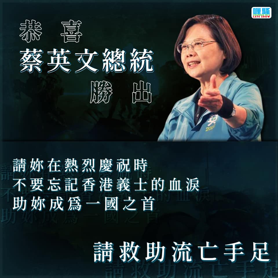 杜汶澤在他的臉書粉專表示,恭喜蔡總統成功連任,「但在妳熱烈慶祝的同時,希望妳記得協助妳當選的香港義士的血淚,希望你會繼續為香港抗爭者發聲。」