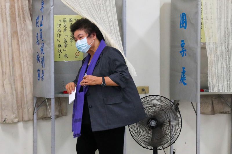 高雄市長韓國瑜罷免案投票6日登場,前高雄市長陳菊上午到新上國小投票。(圖:中央社)