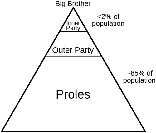 《一九八四》大洋國的社會結構: 上等階級的核心黨員(Inner Party),佔全國人口2%;中等階級的外圍黨員(Outer Party),佔全國人口13%;下等階級的無產階級(Proles),佔全國人口85%。