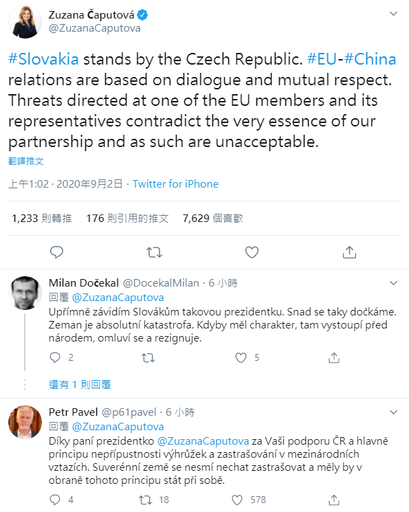 查普托娃1日推文指出,「斯洛伐克支持捷克;歐盟與中國關係是以對話和相互尊重為基礎,針對歐盟成員及其代表的威脅與彼此間的夥伴關係有所衝突,因此不能接受」。
