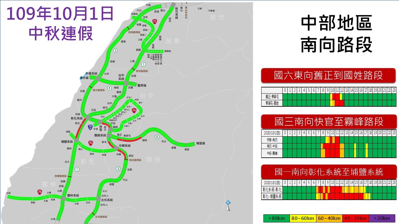 中秋連假首日中部路段南向路況預報圖。(高公局提供)