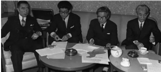 1967年2月28日,東京帝國大飯店。左起:三島由紀夫、安部公房、石川淳、川端康成。(網路圖片)